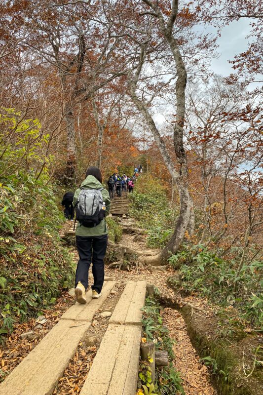 危険な登山と聞きながらも実際の登山ルートを進んでいくと意外にも木道が整備されており比較的歩きやすいじゃないですか! これなら体力に自信のない私でもゴールまで行けそうです。
