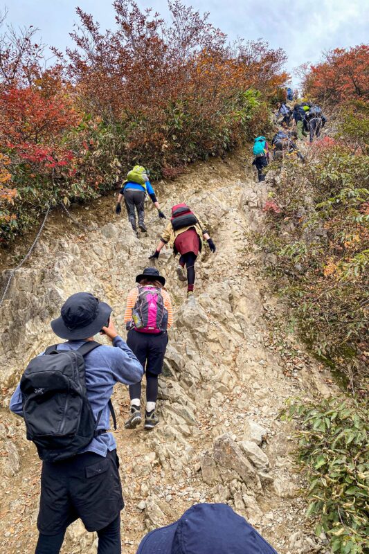 オフシーズンというか紅葉の時期でなければこんなに多くの人が押し寄せることはないのでしょうけれど、この週末は天気予報を信じて訪れる人が多かったようで登山道はご覧の通り。ロープウェイ運行開始時間の1時間後くらいで我々は登り始めましたから、早い人は頂上から下山してくる人もいたりして、この道でのすれ違いは結構大変でした。