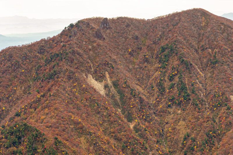 今回登頂を断念し引き返したポイント ”天狗の溜まり場” はこの位置。こうして見ると本当にあと少しで頂上だったんですけどね。天候には逆らわないのが賢明と判断した結果です。また次回チャンスがあれば登頂に向けて挑戦してみたいですね。ただし登山道の歩きやすさを考慮してなるべく秋の紅葉シーズンではなく春から初夏くらいが良さそうな感じ。
