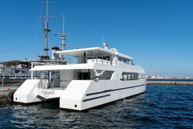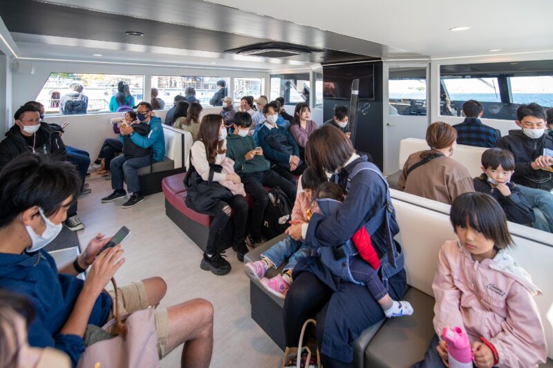 そしてこの後すぐに乗船となったわけですが、もう乗るわ乗るわ、そんなに乗ったら沈んじゃいますよ!というくらい。でも、この船、定員は290名くらいなのでそれでも十分安全な範囲で運行しているんですね。観光船に関しては今年の知床沈没事故以来ちょっとナイーブになっておりました。
