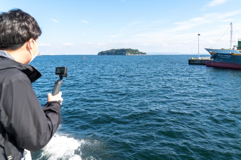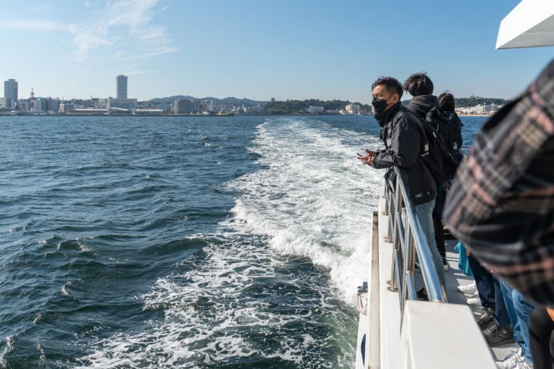 穏やかな日だったとは言え多少は船も揺れますから、手すりを乗り越えて落ちないようしっかり足で踏ん張って立っておりました。この船結構スピード出るんですよ。振り返ればまだそれほど遠くない距離に横須賀の街が見えます。猿島って本当に三笠ターミナルから目と鼻の先なんですね。