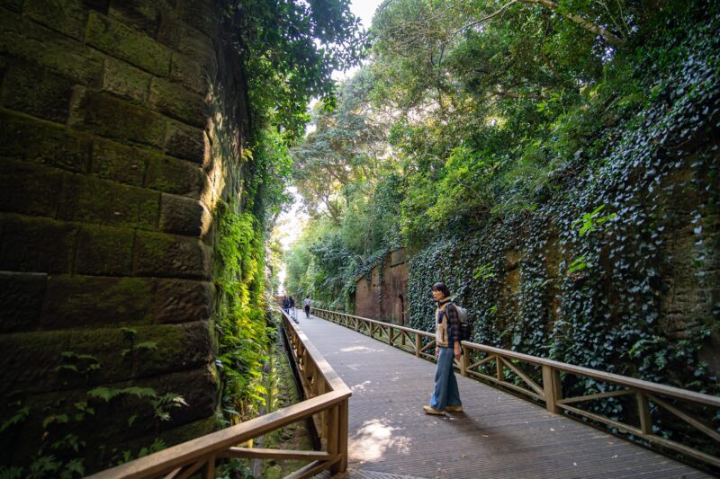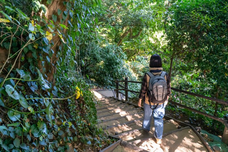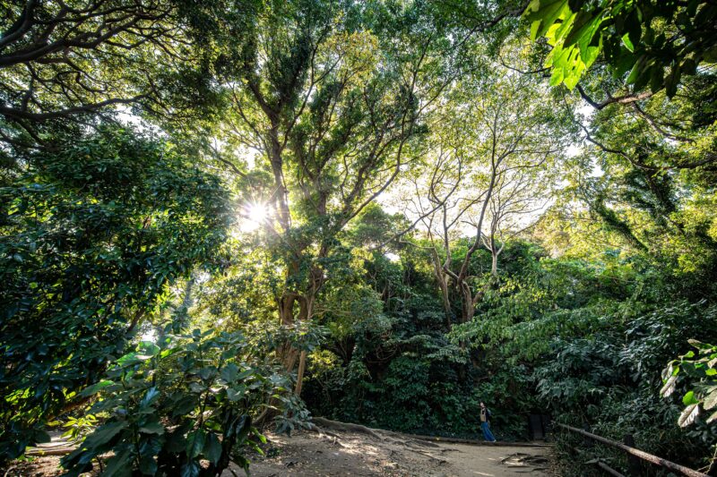 通路から上を見上げればもう空さえも覆いつくす勢い。この木々の成長っぷりはどちらかというと沖縄やその周辺の離島みたいですね。とても神奈川県とは思えません。