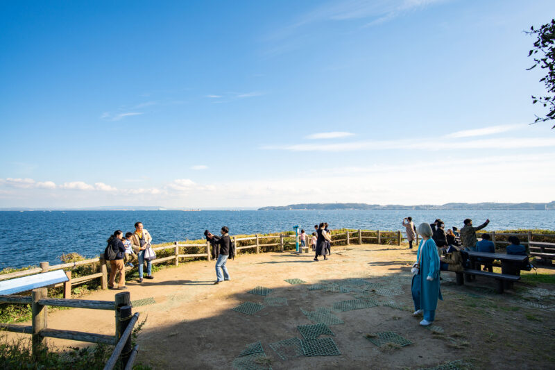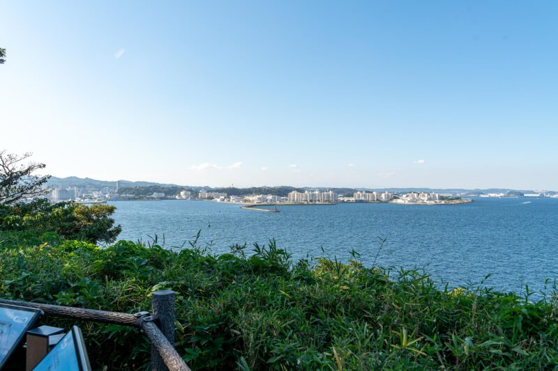 階段を上りきった所には展望台とされる建物が現れます。現在は展望台は閉鎖されており立ち入ることが出来ないものの、少し開けたこの場所であれば横須賀方面を一望する事が出来ます。遠くに見える景色はやはりリゾート地のようですね。