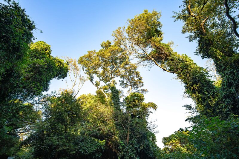 何かのイベントのために人工的に装飾を施したかの如く大きな木の幹に蔦や他の植物が絡みつき自生した結果、他では見たことがないようなシルエットになってしまっています。こうした木々によって光が遮られるため、日陰は少し寒いくらいでした。