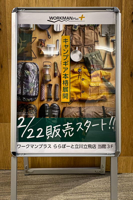 そんなワークマン、我が家の行きつけは立川立飛のららぽーと内の店舗なのですが、先日写真のような看板を見かけました。キャンプ用品本格展開とはなかなか楽しみなキャッチじゃないですか!そういえば我が家のメスティンはワークマンのものだったような?