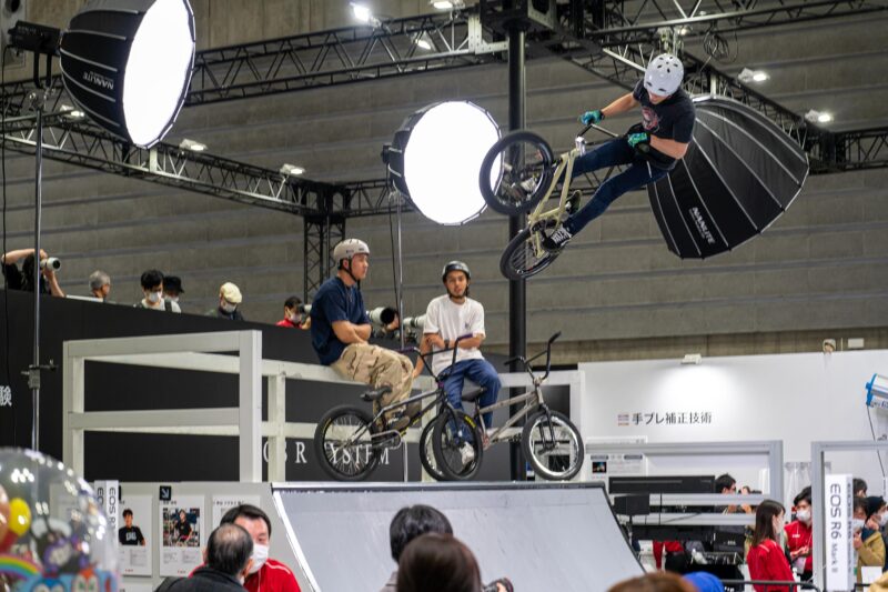 今年会場内で一番広い駒数を展開していたのがCanonブースだったように思います。ブース内にはBMXの特設コースが設置されており、プロと思われるBMXライダーがハーフパイプを行ったり来たりしながらジャンプしておりました。