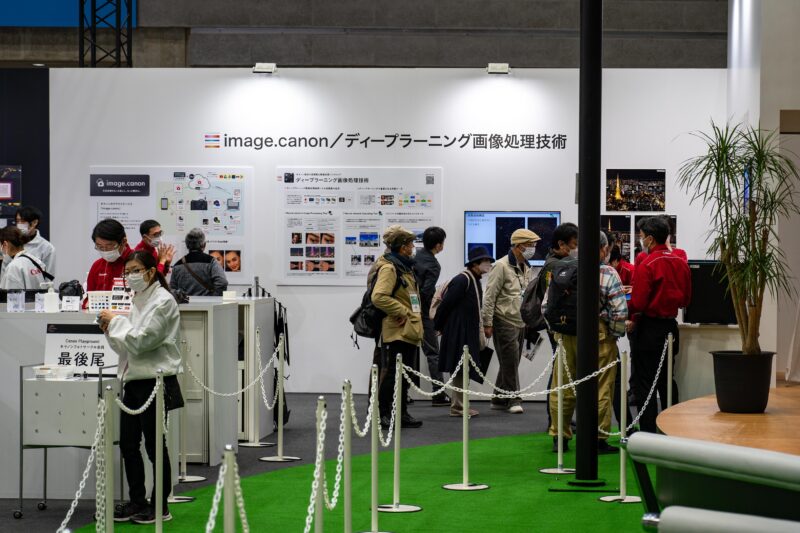 もうこの時点で幻滅ですよ。私はCanonブースにカメラを見に行きたかったのではなくディープラーニングを用いた画像の高解像度技術が展示されているとの情報を得ていたため、そのノウハウや効果の程を確認したかったんですけどね、予約制で待ち時間が発生するなら見なくてもいいや...と判断し今年のCanonブースには足を踏み入れることすらありませんでした。上の写真はブースの外から展示パネルを撮影したものですが、このように目と鼻の先に情報があるのにそこへは近づけないという...。