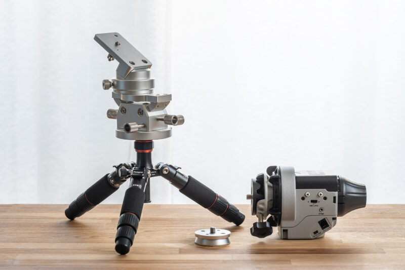 年間1,2回しか使うことのない天体撮影用の極軸微動ユニット。写真の三脚に取り付けられた銀色のブロックがそれ。実際の天体撮影ではもっと大きくがっちりした三脚を組み合わせますが、今日は卓上説明用にミニ三脚に取り付けています。