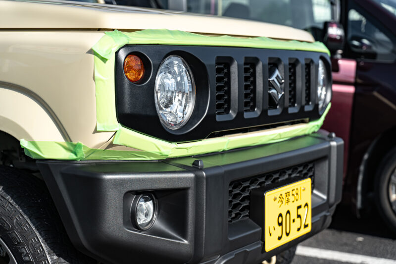 ジムニーの場合、フロントグリル、フロントバンパー、リアバンパー、ドアミラー取り付け部、リアハッチヒンジ、アンテナ取り付け部分、が未塗装樹脂パーツですから、納車後何も手をかけず紫外線を浴び続ければ普通は黒いプラスチックが白っぽく変色していくもの。