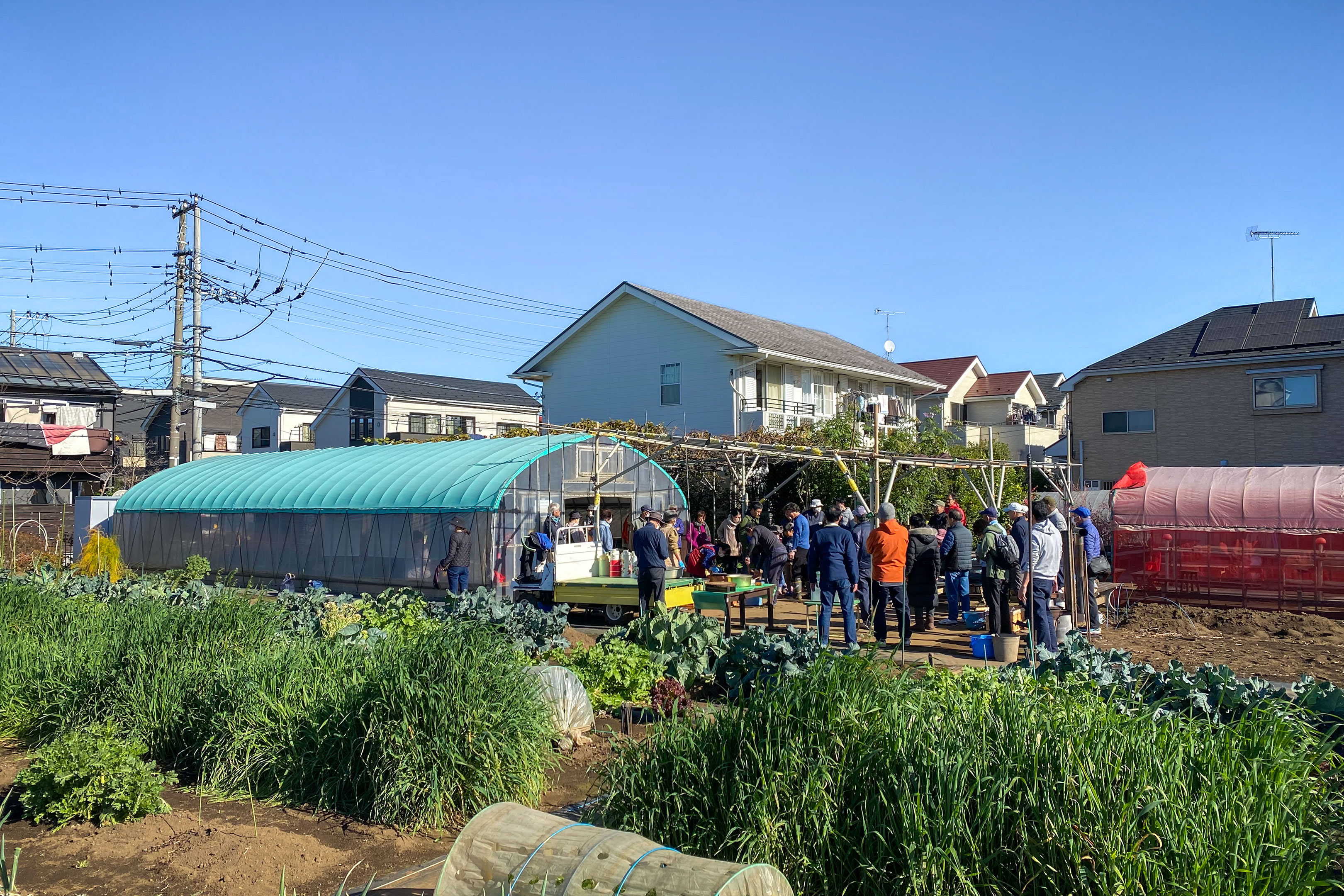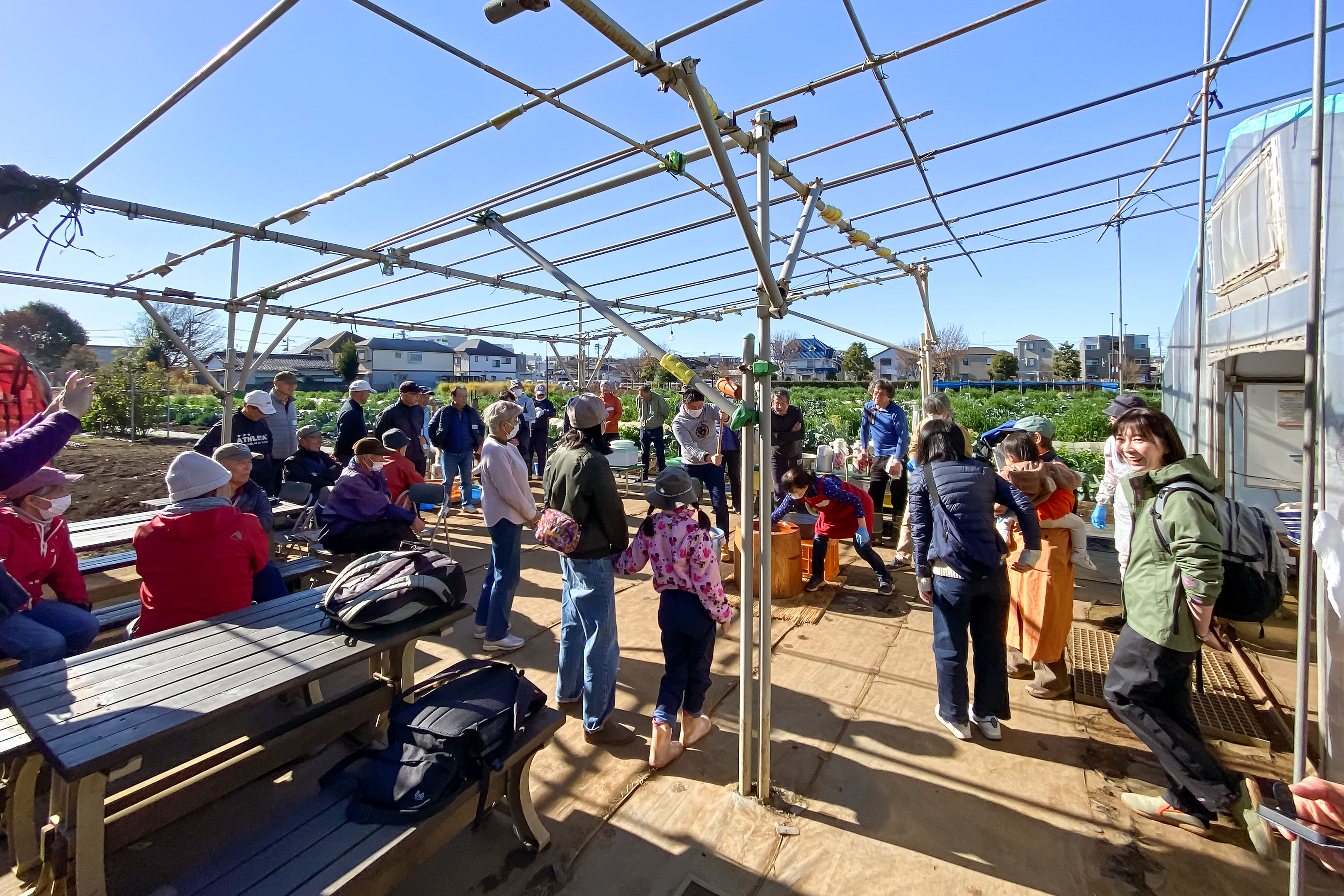 体験農園というと普通は畑の1区画を借りて野菜を育ててみる...くらいの事を想像しますが、我が家が契約している農園では畑作業以外のイベントを年に数回計画してくれていて、希望者はこんなふうに集まって季節の行事を楽しむことができます。
