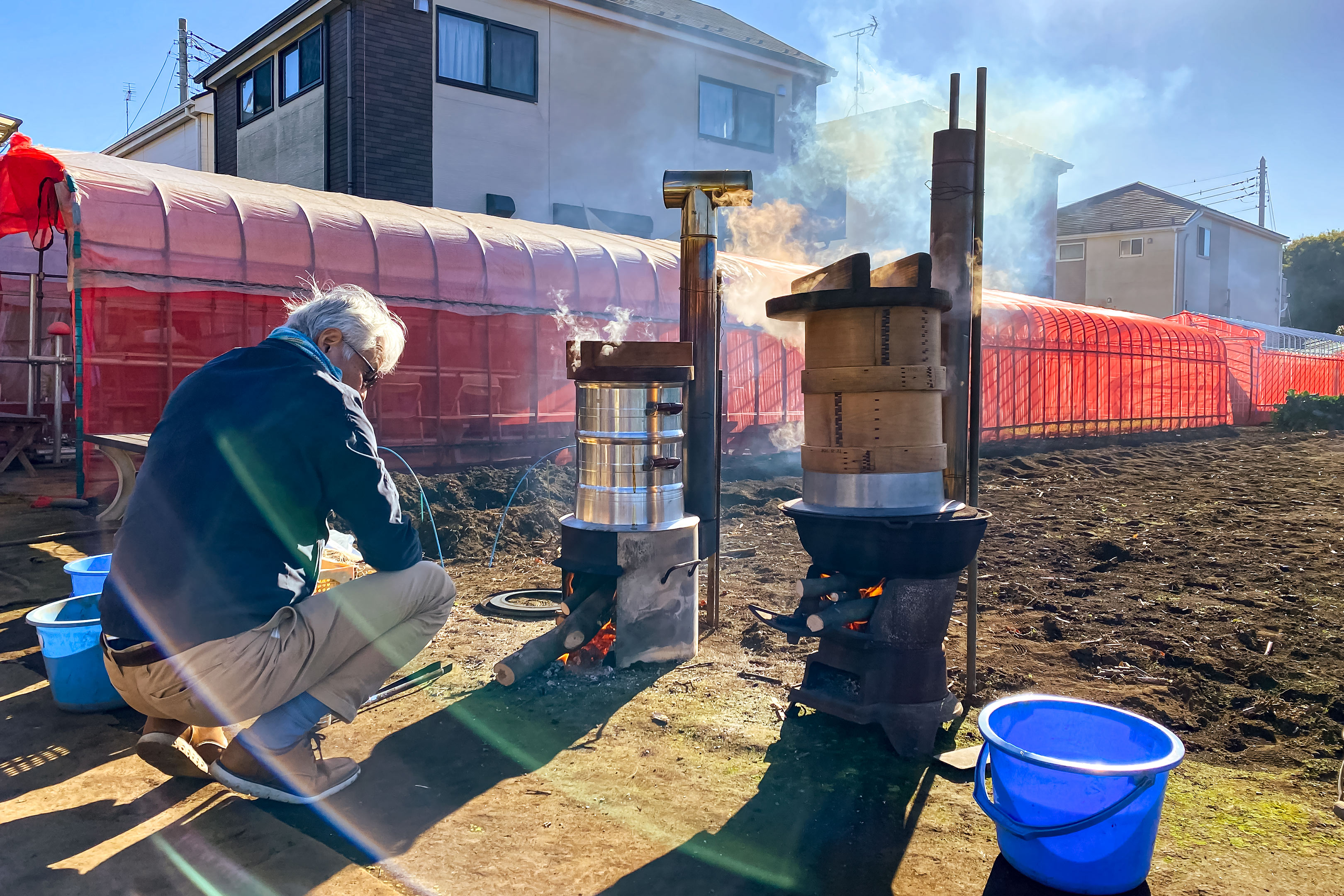 餅つきの前には当然餅米を蒸さないといけませんから、釜戸の薪当番が火加減を絶妙なところで調整します。もう皆職人ですね。しかしこの日のためにこうした釜戸を所有している園主さんも凄いと思いますが...。