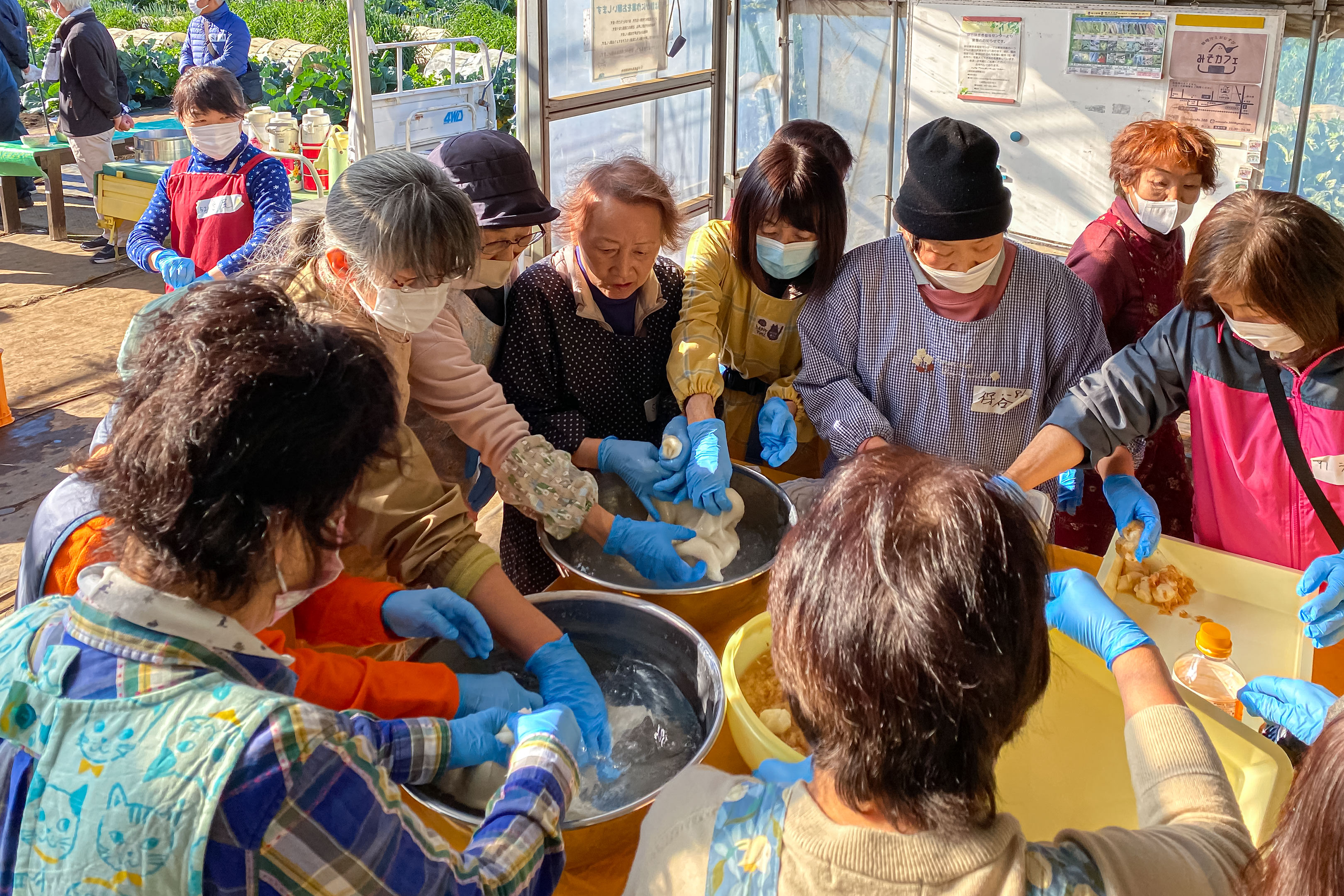つき終えたお餅は直ぐに隣のハウスに移動され、こちらで女性参加者による味付けが行われます。この写真を見るだけでもその有志が伺えますね。