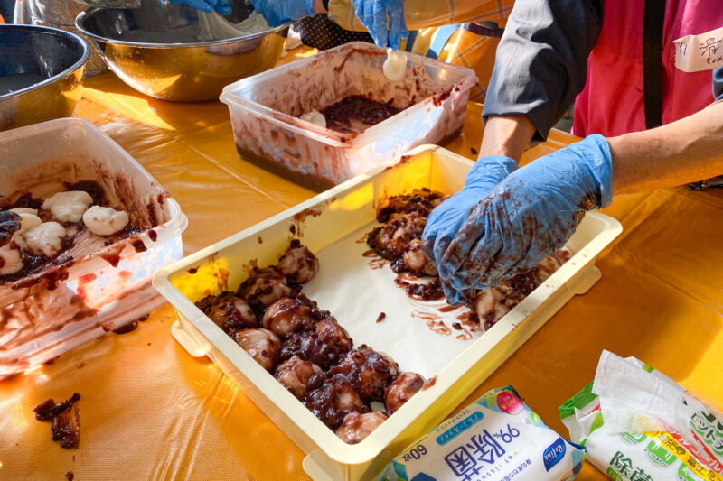 今日私が食べたお餅の数は合計8個でしたから、仮にそれを平均値とすると参加者100人であれば単純計算で800個のお餅に味付けをするわけですから、これくらいの人海戦術でなければ作れないですね。
