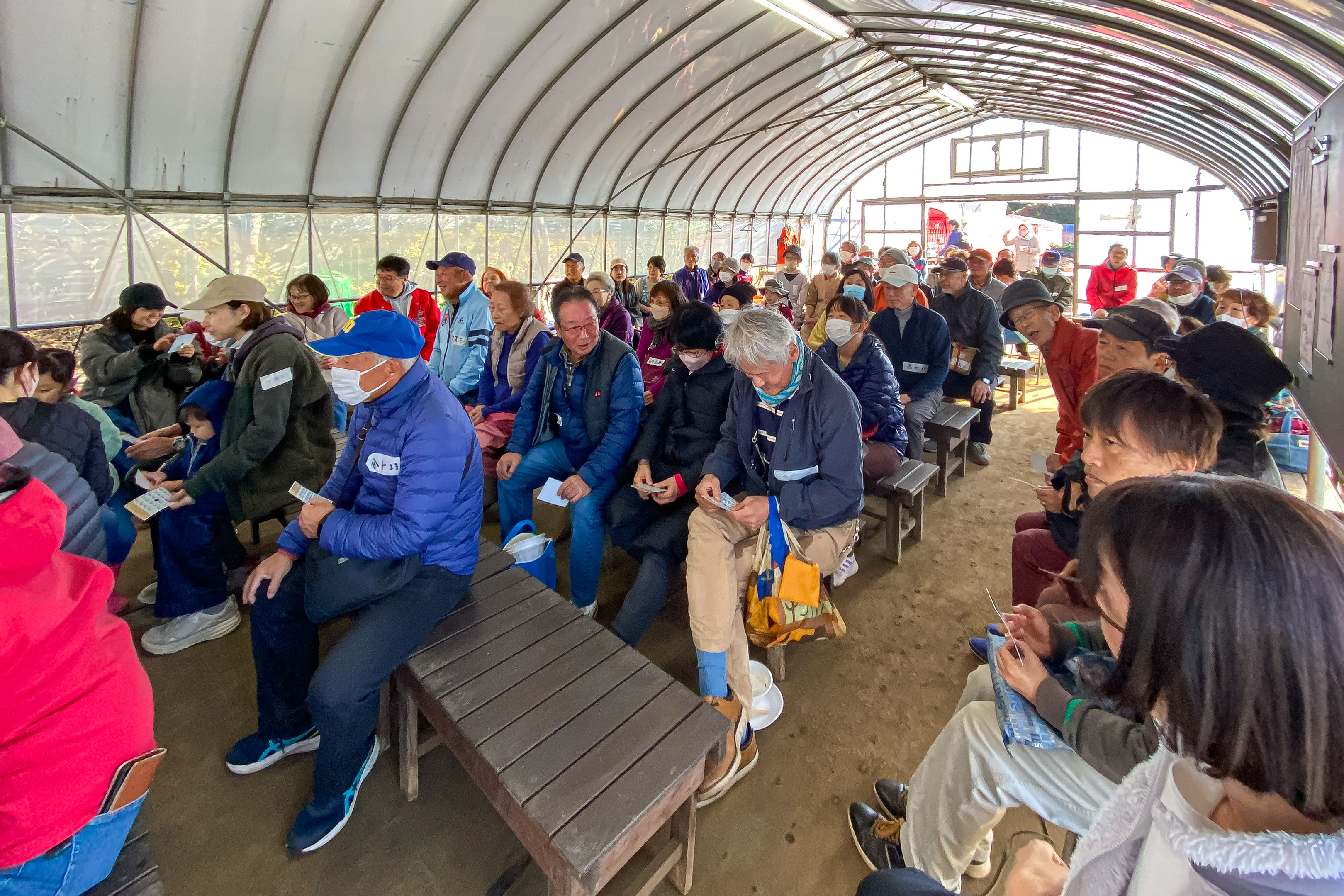 この写真だけ見るとなんだか ”近所にゴミ処理場が作られる事への住民の反対抗議の図” みたいに見えますが、これは今日のイベントもう一つの楽しみ大ビンゴ大会の様子。