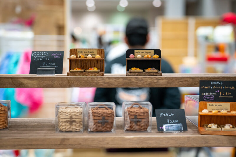 パンなどの食品ミニチュアが小さな棚に並べられています。サイズで言ったらひとつひとつが1cm以下じゃないかと思います。手先が器用とかいう工作制度の高さもですが、これを大量生産するだけの根気に驚きます。