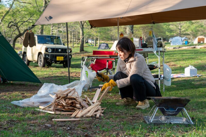 この季節だと多くのキャンパーが17時くらいから焚き火を始めますからそれに合わせて諸々の準備を。今回は現地で薪を購入する事はせず、檜の端材を道中で沢山頂ける計画だったため、燃やしやすい適度なサイズになるまで多少の薪割りのみ行いました。
