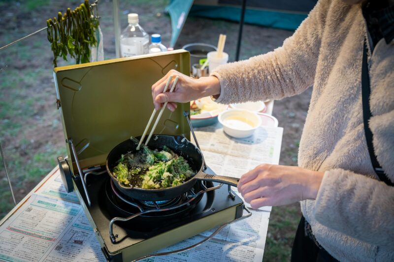 水分を飛ばしたかった理由は他でもなくこの日のメニューが天ぷらだったから。キャンプで天ぷらってあまり聞いたことがないものの、カセットガスコンロを使えば火力も安定して上手く出来上がります。前日のメニューがあらかじめ準備しておいた肉でバーベキューでしたから2日目はこんな感じも良いかなと。揚げたての天ぷらは最高に美味しくいただけました。