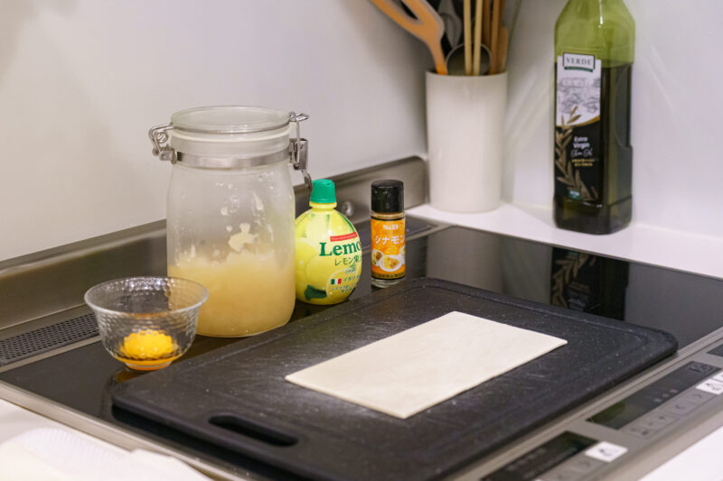 用意したのは冷凍庫にあった ”いつ購入したかわからないパイ生地” とシナモン、そして生卵のみ。一応レモン汁も準備しましたが、考えてみればレモン汁が必要なのはりんごジャムを作る工程でしたね。今回は使わず。