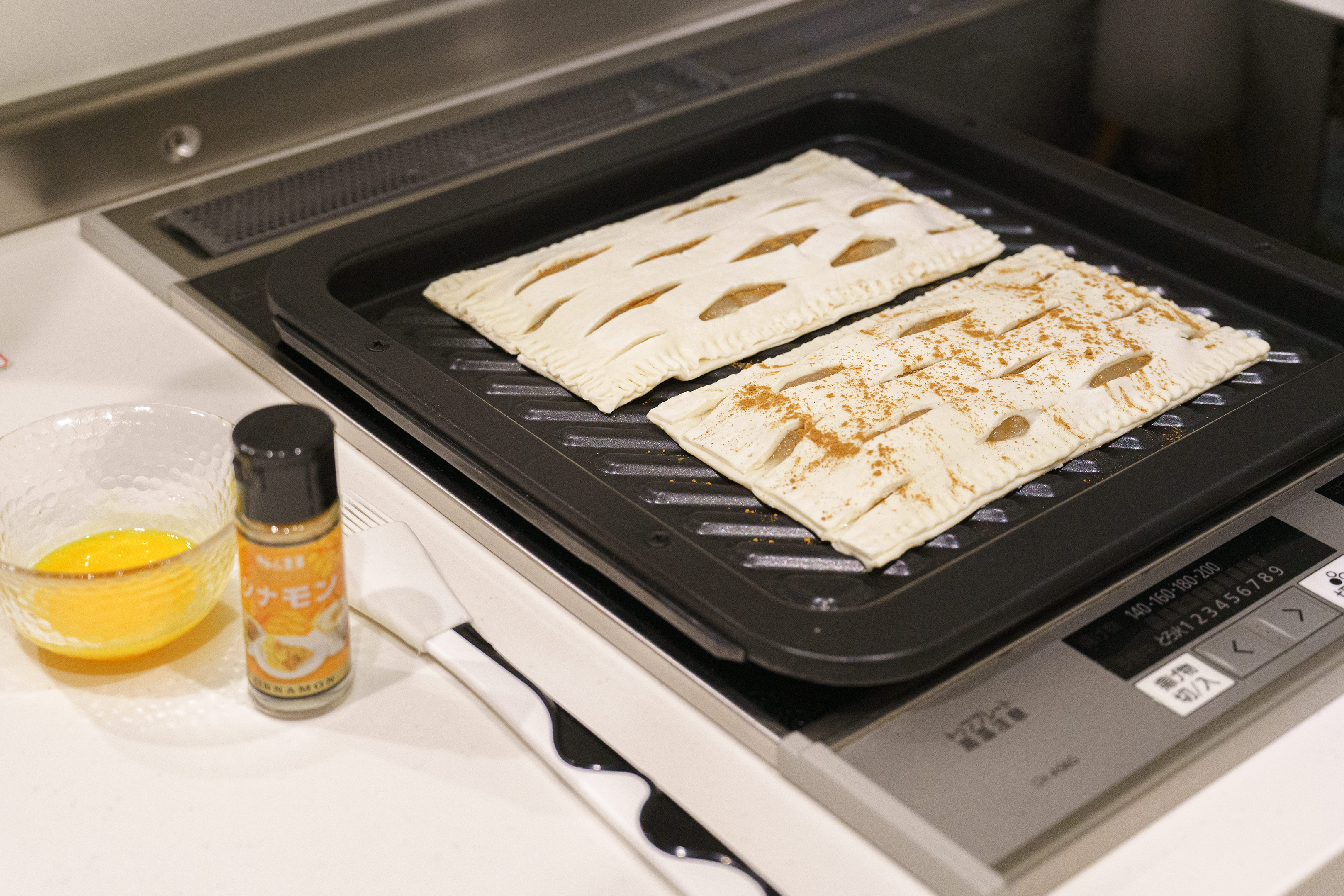 見た目はほどほどに仕上がり、パイ生地の上から振りかけたシナモンもこうしてみるとむしろ美味しそうに見える...。逆に生地の上にシナモンをかけていない方はちょっとのっぺらぼうな感じ。次回からは後掛けが良いかも!