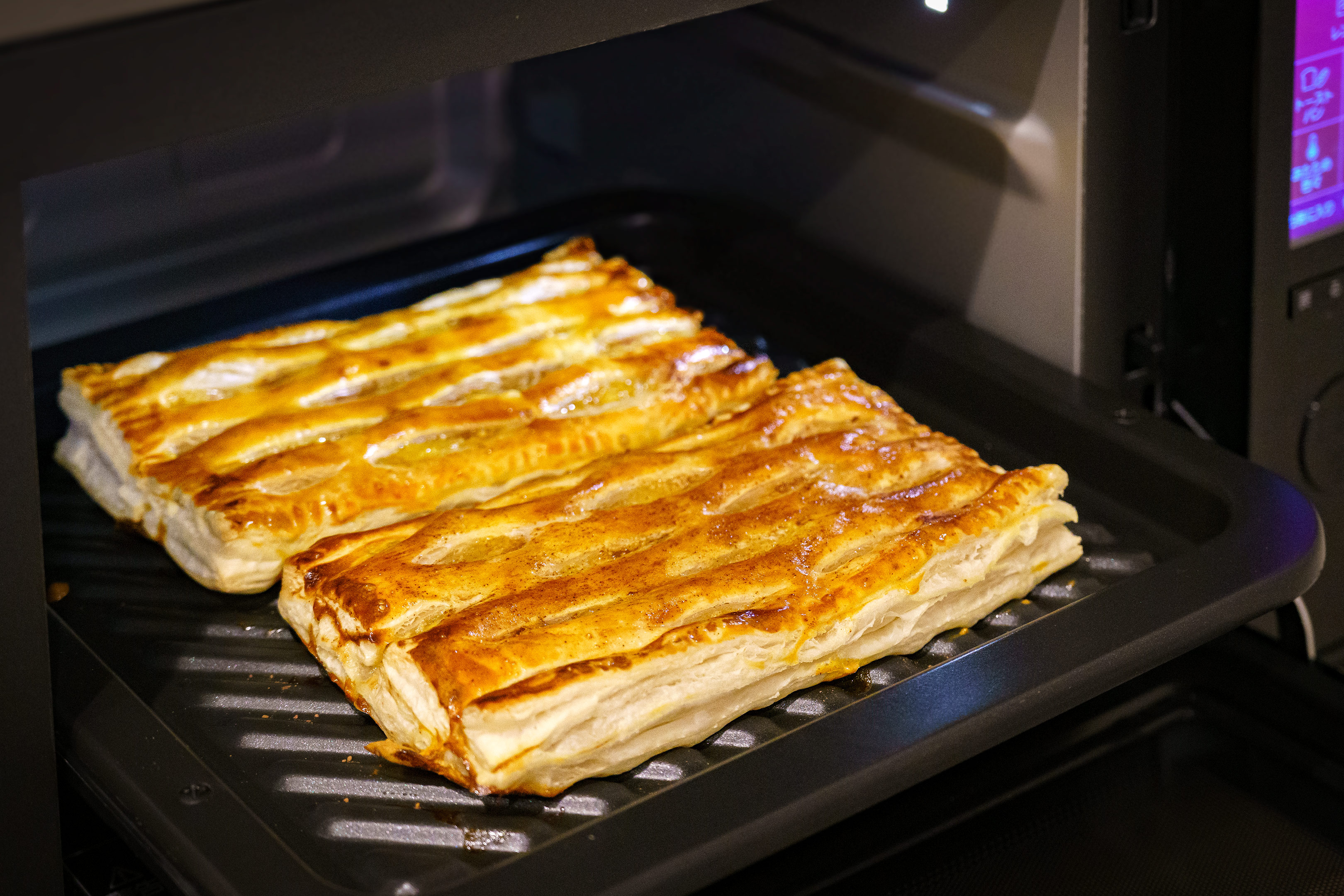 オーブンを200℃で予熱しておき、パイを投入後20分で完成。我が家のオーブンはトレイの差し込み口が上段下段の2箇所あるのですが、こういう時いったいどちらのポジションを使うか迷うんですよね。今回は安全第一でまずは下段にセットして焼いてみました。焦げが足りないようなら追加で上段加熱できますからね。結果的に下段のみの調理で仕上がりました。