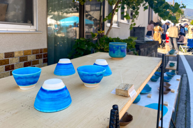 山梨だからでしょうね、見るからに富士山を意識したお猪口。色使いも大変綺麗。冷静に考えると普段使いはしづらい色にも思えますが、こういう場に並ぶとグッと目を惹きます。焼き物でこういう鮮やかな色を表現するのは難しいのでしょうね。