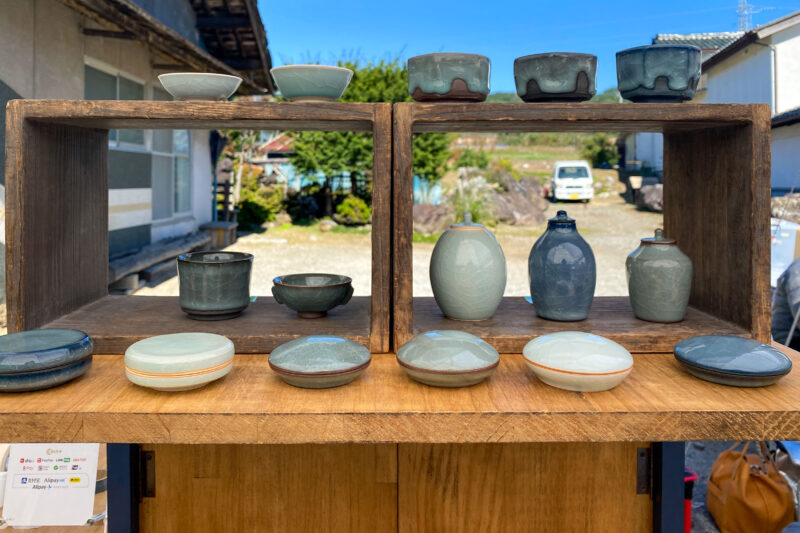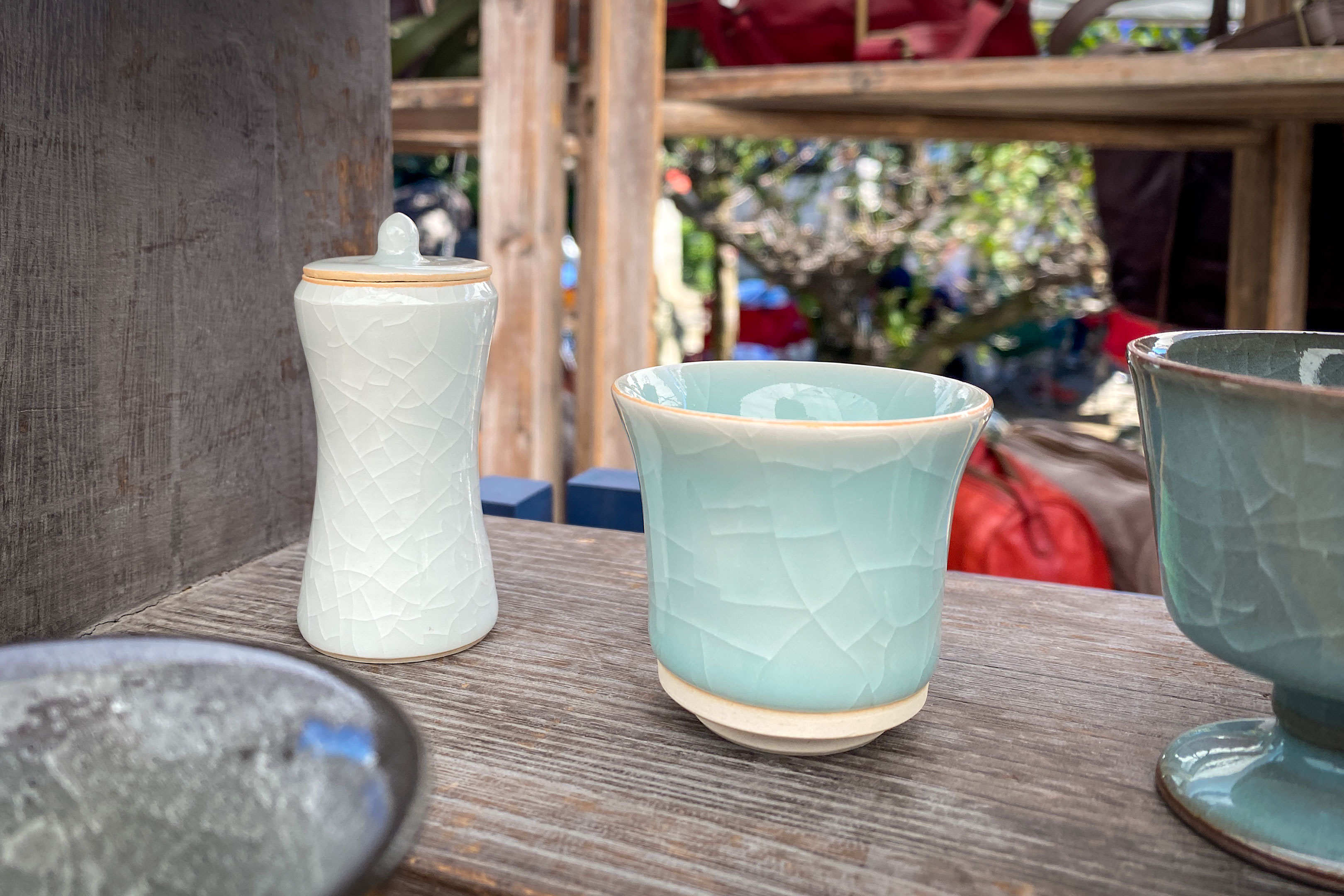 手前にある蓋付きの薄っぺらい陶器が一体何をするものなのかは理解しておりませんが、この蓋と本体の接触面の精度ときたら、焼き物でこんな精度が出せるのか!と声に出してしまうほど精密に作られておりました。そしてその上下の接触面にのみポイントとなるカラーが入っていてまあ美しいこと!