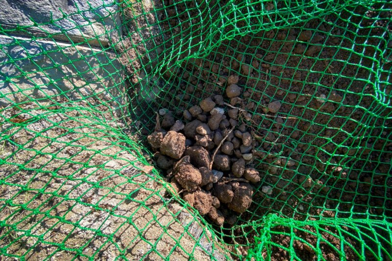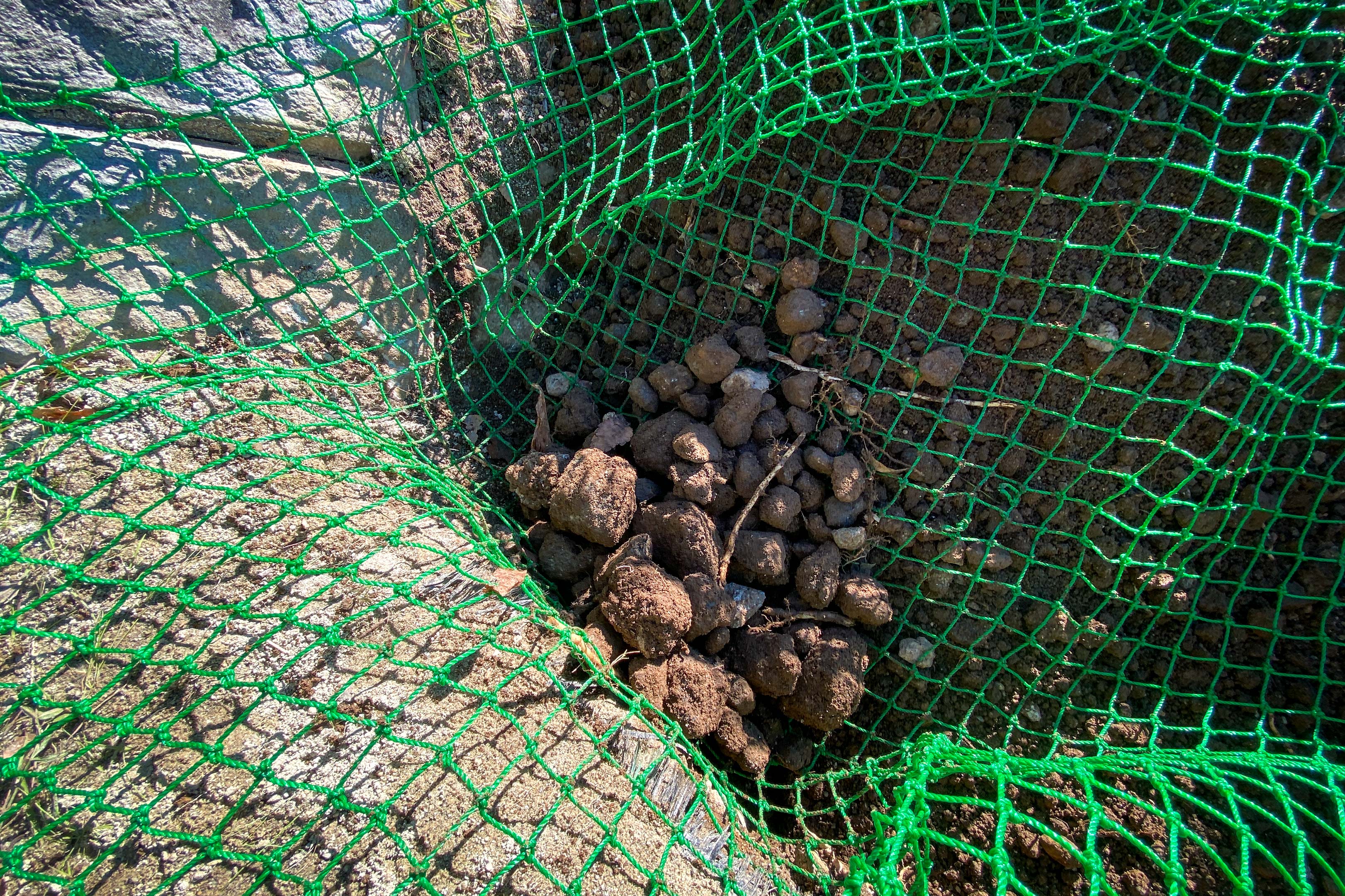 最終的には深さ50-60cmくらいまでをフカフカの土にしたいですからなるべく簡単にそして効率的に土と砂利を分別したく、動物避け用のネットを買ってきてその上に土を盛り、前後左右に揺することで土だけを落として石ころを救いあげる作戦。早い話がネットを利用したふるいを準備したというわけです。