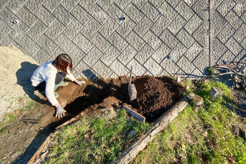 この日約半日かけて掘れたのは上の写真にあるように木の板が差し込んである位置から向こう側の約1平米。半日かかって1平米ですよ! まあここは足場が悪かったり、隣に既に植っている作物に影響が出ないよう作業をしたため効率が悪かったのは間違いないですが、大きな石ころや砂利が混ざってガチガチに固まった土地を畑のような柔らかい土に土壌改良するのがこうも大変な作業かと改めて感じ、その昔この辺りを農地へと開拓した人を尊敬しました。