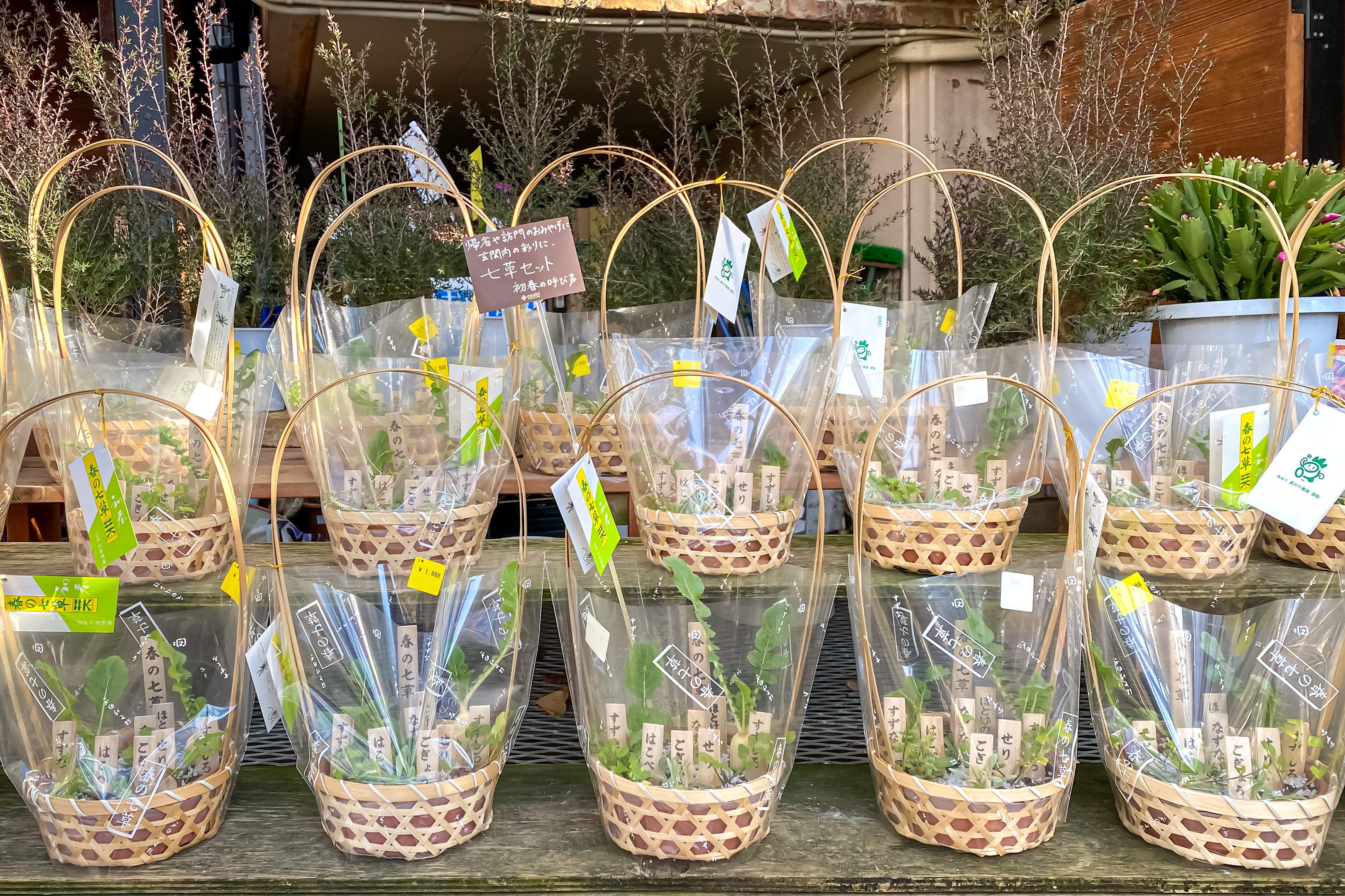 せり、なずな、ごぎょう、はこべら、ほとけのざ、すずな、すずしろ。これらを現代風に変換したら?と言われたら私もよく知りませんが、その全てを鉢植えにして販売するというのはなんともガーデニングショップらしいアイデアで良いですね。