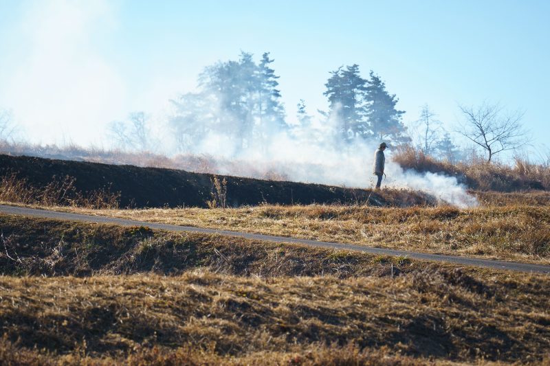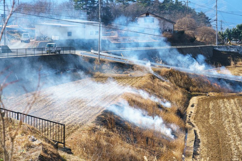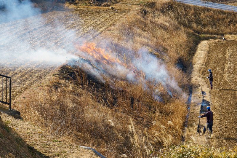 田舎育ちの私はピンときました。これは野焼きとか土手焼きと呼ばれるもの。地域にもよるのかもしれませんが農家さんであれば多くの人が毎年経験する農作業の一環ですね。