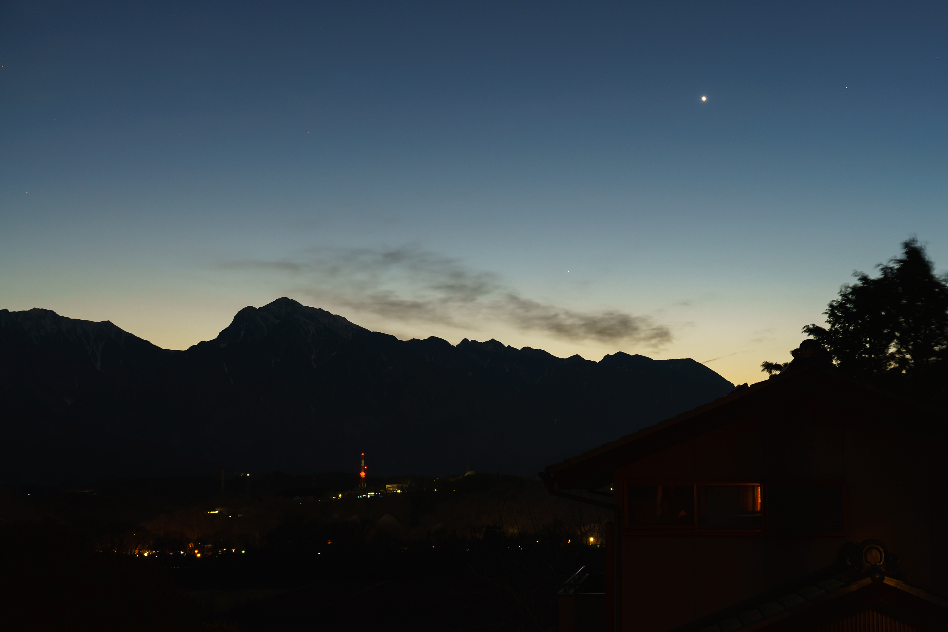 母親が他界した日から毎日空を眺めています。その当日は薄明光線による天国からのお迎えのような空、通夜から葬儀は真っ白な雪、そして今日は山梨から実家の方向に一番星が出ていました。人が亡くなると星になると言いますが、先日の薄明光線に続き今日の星はもしかして...。