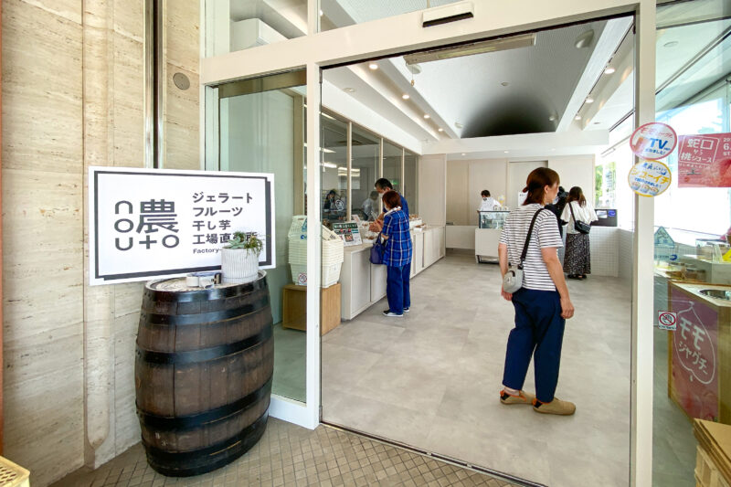 店内を見てびっくり、お土産や特産物がずらっと並んでいるのかと思いきや案外シンプルな作りで、取り扱われているのはジェラートと、干し芋と、話題の桃ジュースのみ。拍子抜けするくらい殺風景な第一印象。