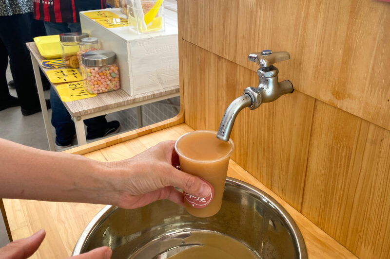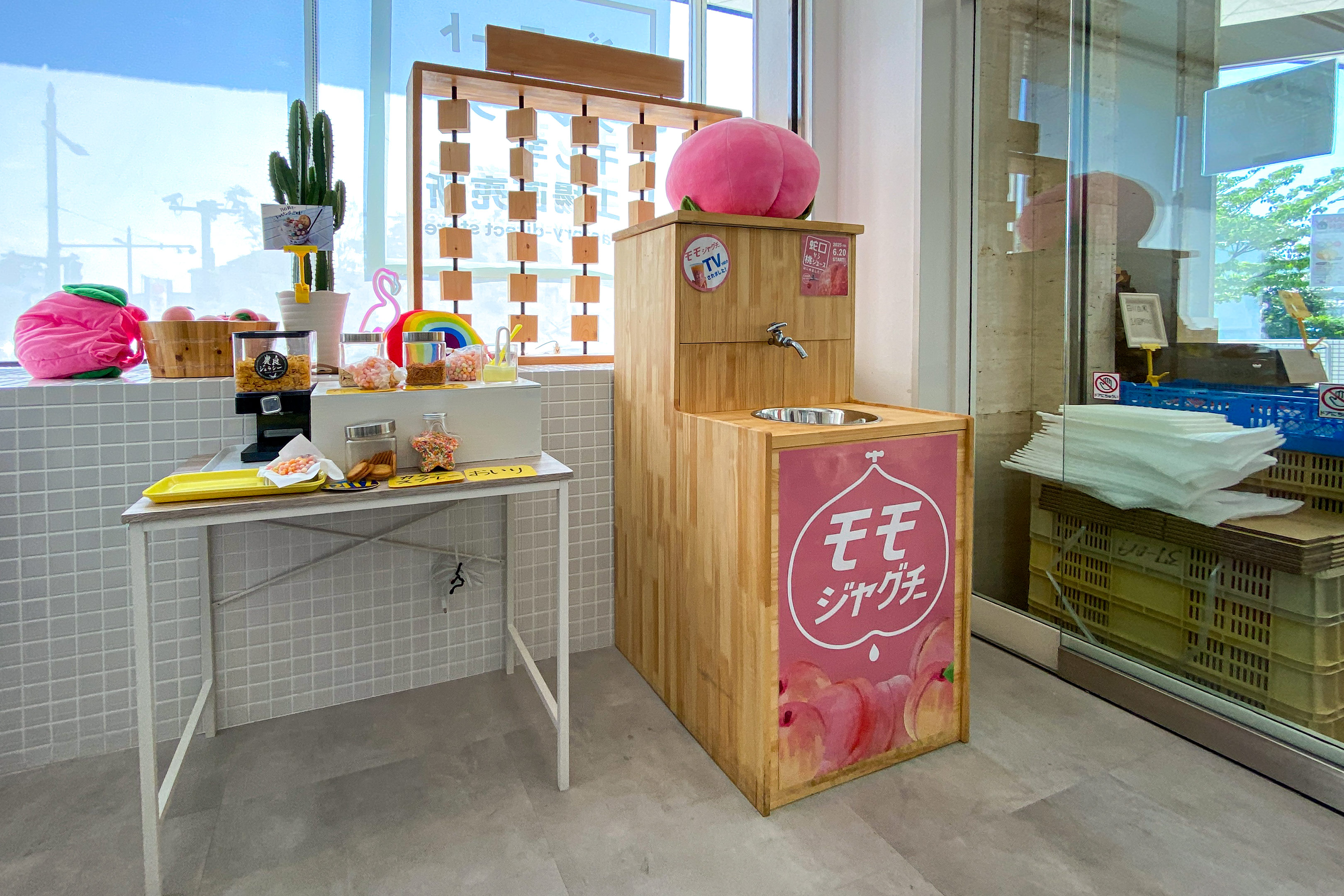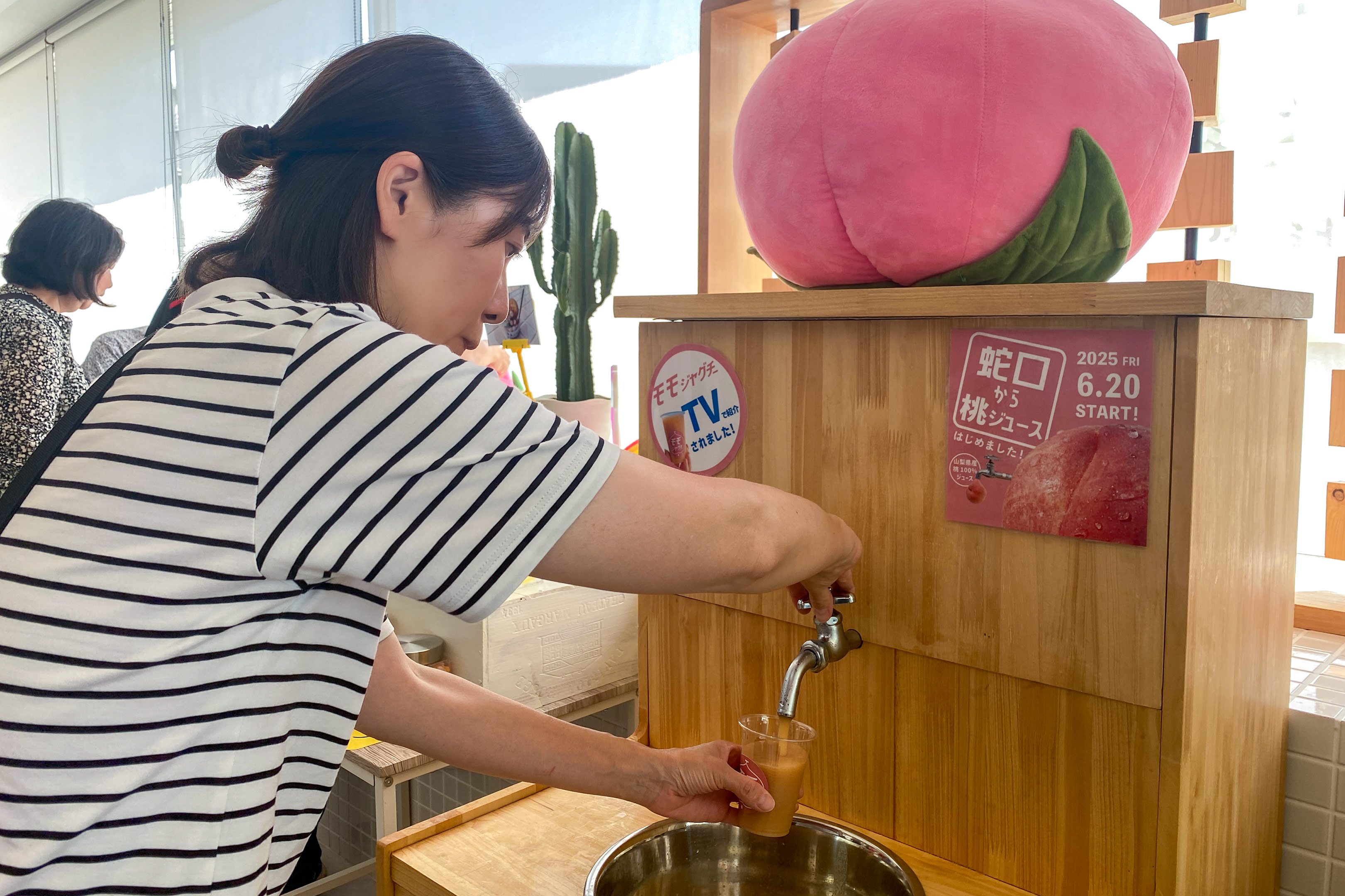 こちらがテレビでも紹介された蛇口から桃のジュースが出てくる「モモジャグチー」。