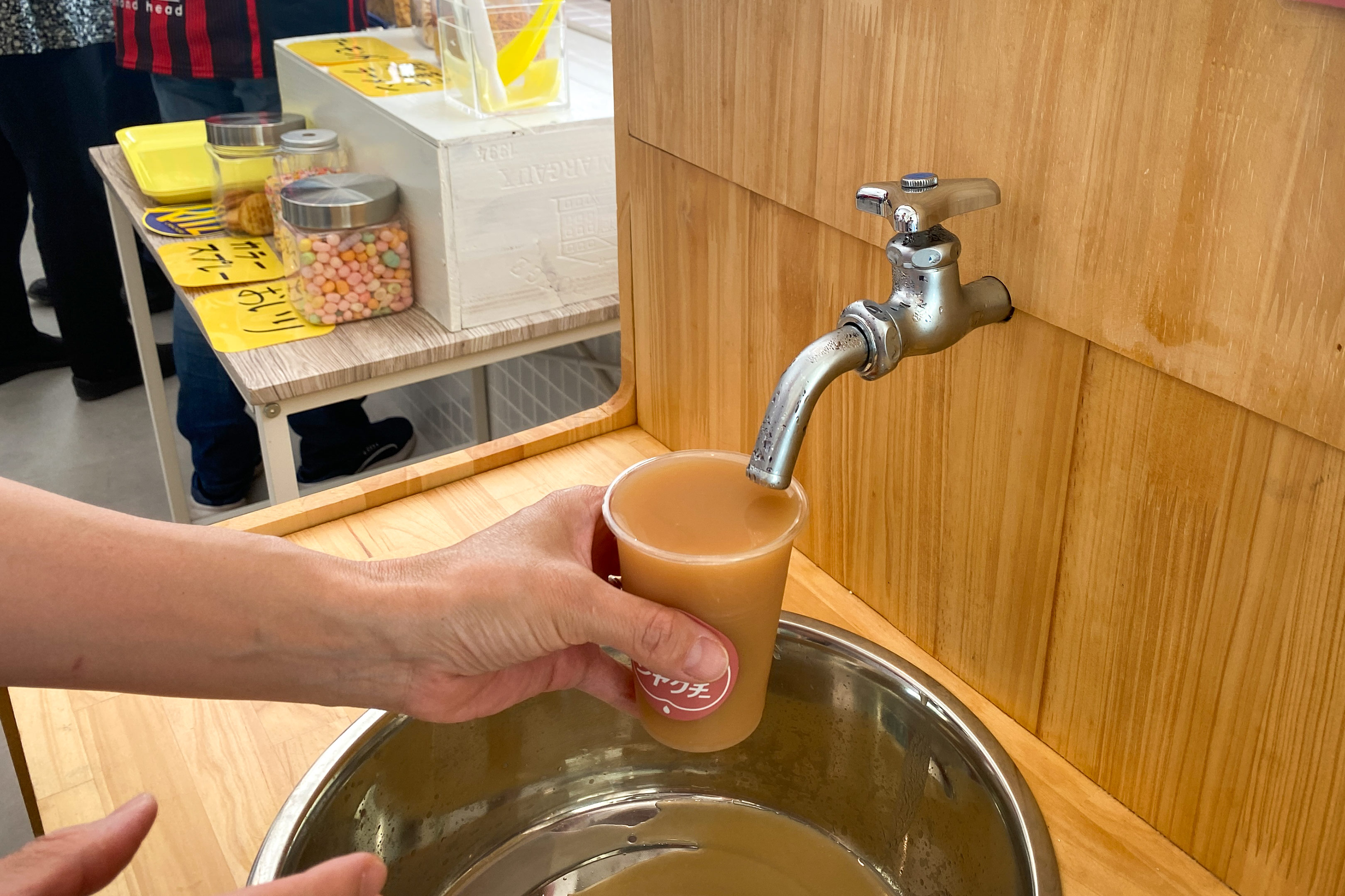 コップ1杯400円という単価で蛇口から注ぐのはセルフですから、誰しもが溢れんばかりにギリギリまで注ぎます。