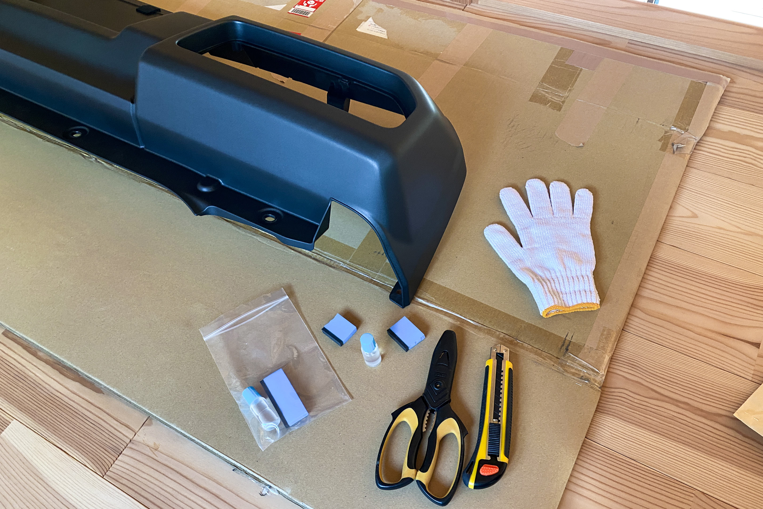 で、普通なら新品を手配しディーラーに交換工賃を払って取り替えてもらうでしょうが、新品バンパーってディーラーだと3万円強しますし私の車の場合その他周辺パーツも同時交換で6万円強(工賃込)と言われており、ちょっと高いなぁと思っていました。