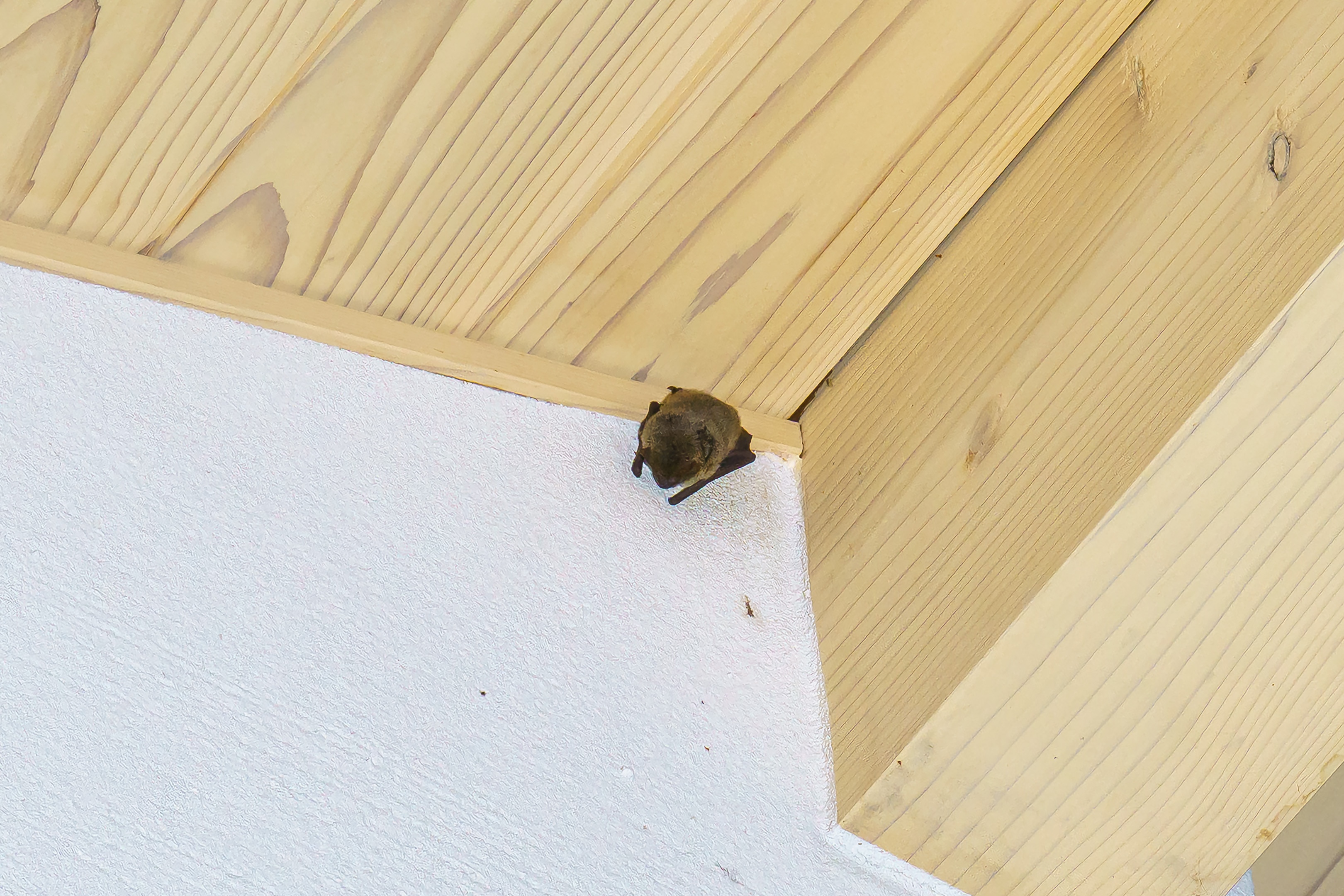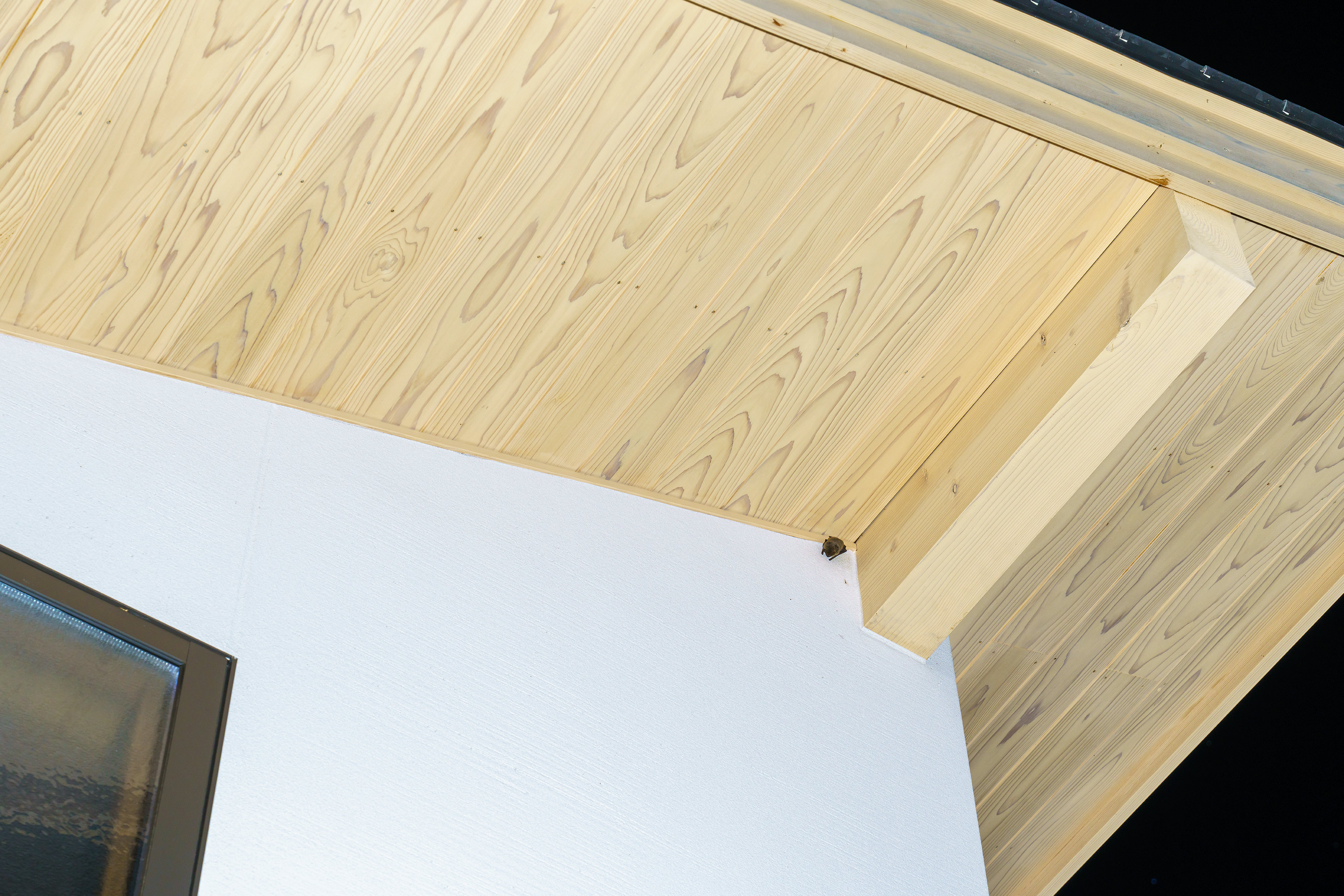 これで正体がはっきりしました。私は最初大きなクモかな?と思っていましたが、実際はこれコウモリですね。家の軒があることで雨を避けることができ、高さがあることで天敵から身を守ることが出来る絶好の場所なのでしょう。以前にも目撃したことがありましたからもしかしたらここへ住み着いてしまっているのかもしれません。