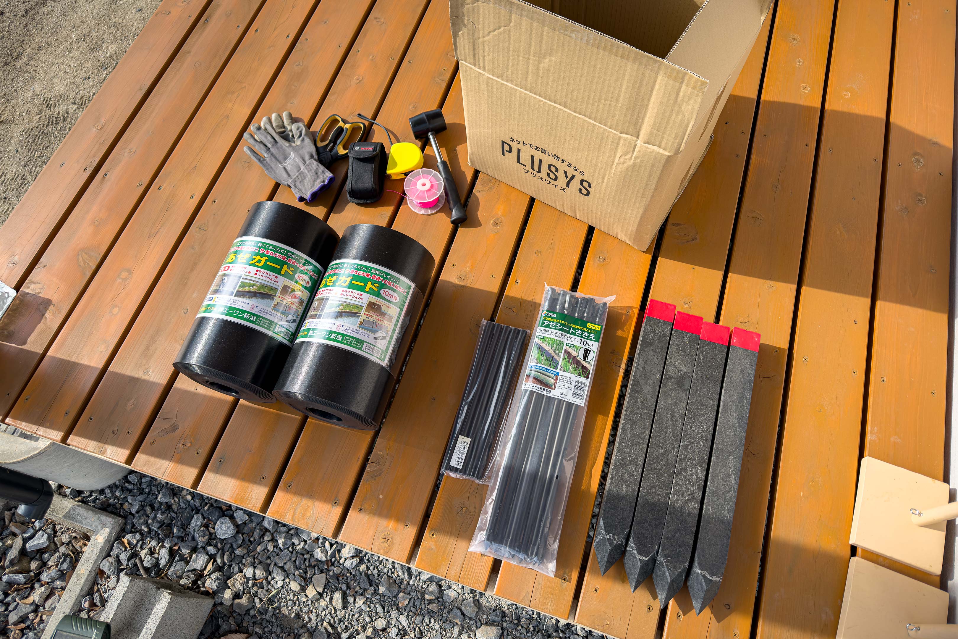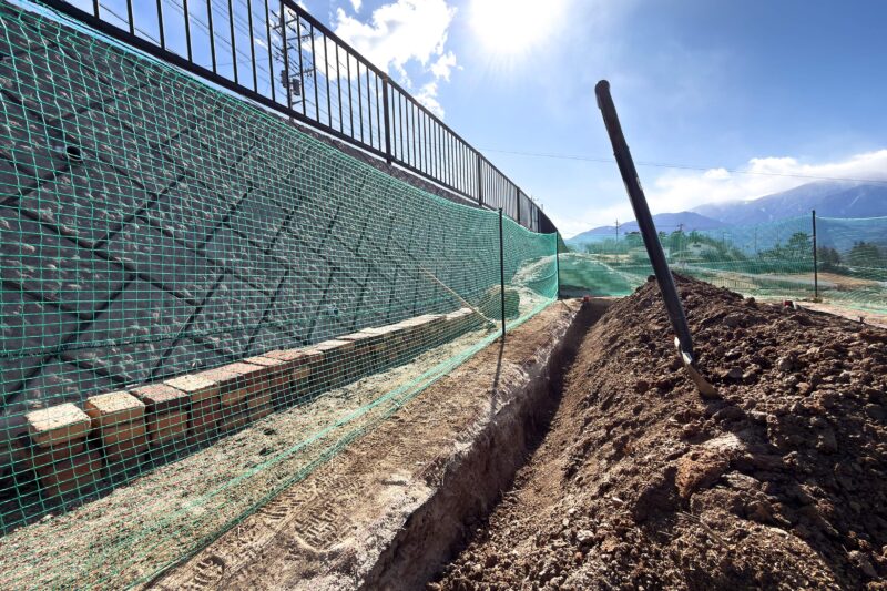 今回の工事は自宅庭に昨年開拓した畑エリアの周囲にプラスチック製のあぜガードなるシートを埋め込む作業。畑と周囲の土や砂を完全に分ける目的のほか、大雨の際、庭に降った雨水が柔らかな土の畑エリアに流れ込むのを防ぐ狙いもあります。