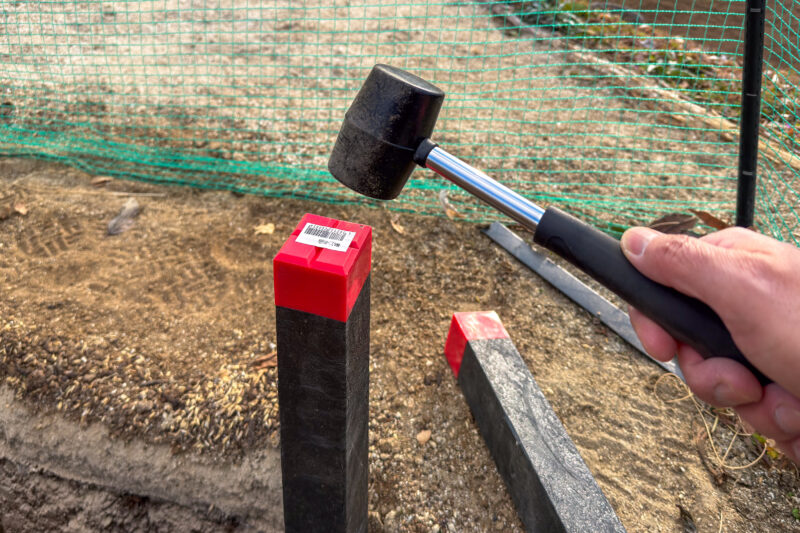 あぜガードを埋め込む前にやるべき工程として畑の四隅に境界杭の打ち込みがあります。予想はしていましたこれが結構大変な作業でして、写真で見れば分かる通り杭のサイズに対して準備したハンマーが小さすぎるのです。