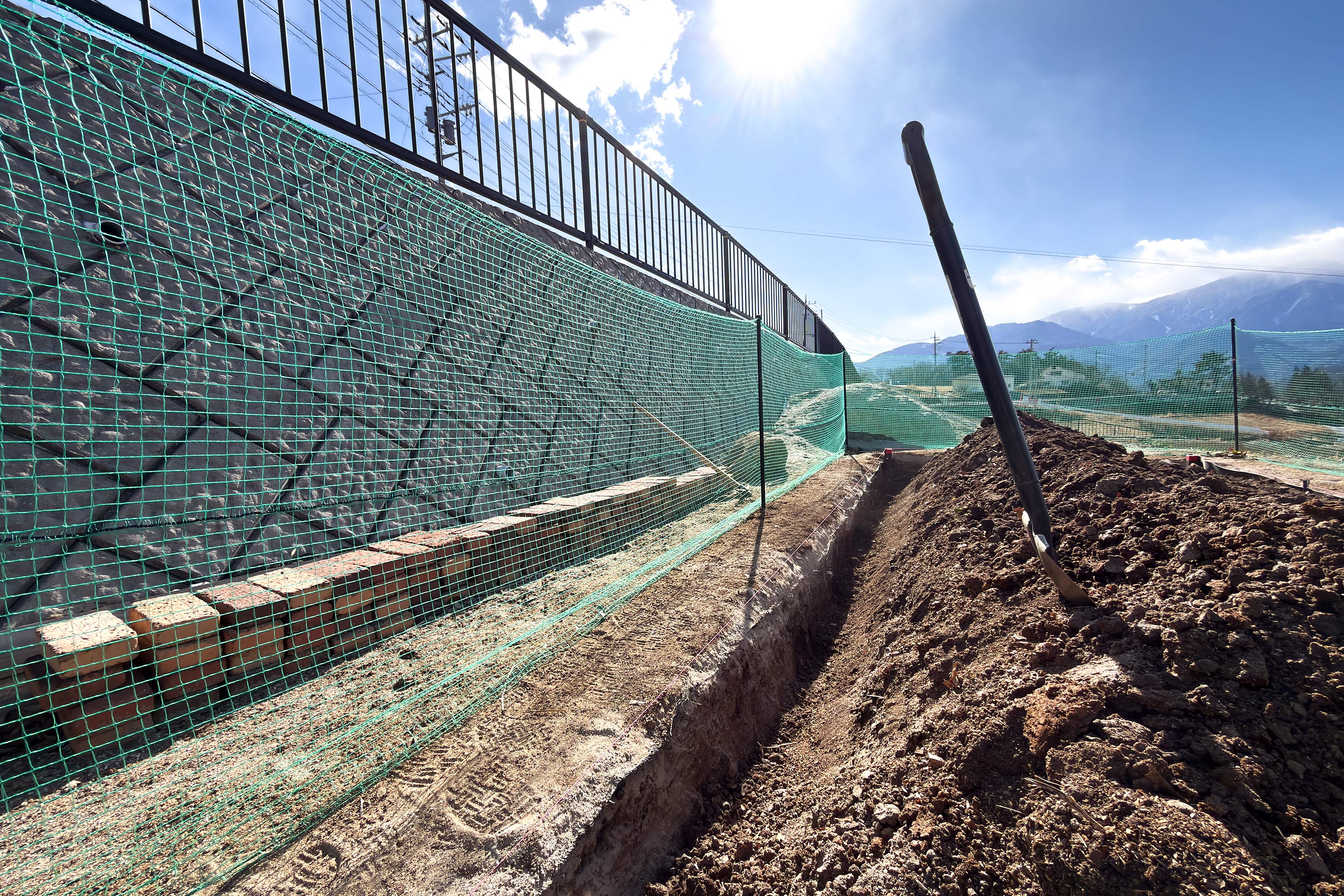 そして難しいのは直前に打ち込んだ4隅の杭の外側に差し込むようにあぜガードを設置しますから、実は杭の外側までを掘っておかなければならないのです。そのため杭の外側を修正していると杭の位置や角度が僅かにずれ、対面の杭との距離が変わってしまい微調整が強いられる...だからレーザ距離計で都度その値を確認しながら...というわけです。