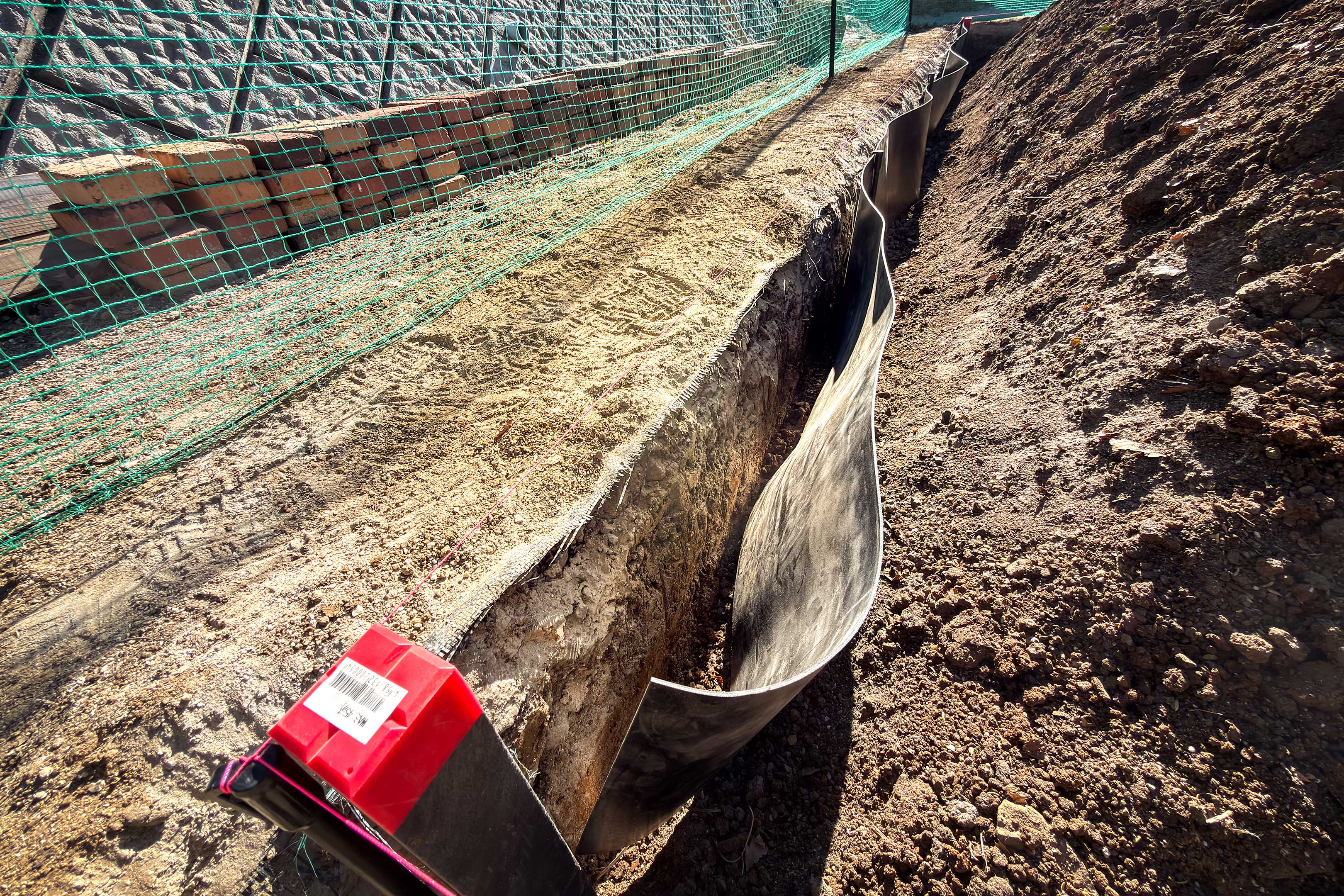 いざ綺麗な面が出せた段階で、寸法通りカットしたあぜガードをあてがってみます。この段階で壁面が凸凹していたり掘りの深さが一部足りず上げ底になっていたりするとプラスチックのあぜガードの収まりが悪く綺麗なラインが出ません。