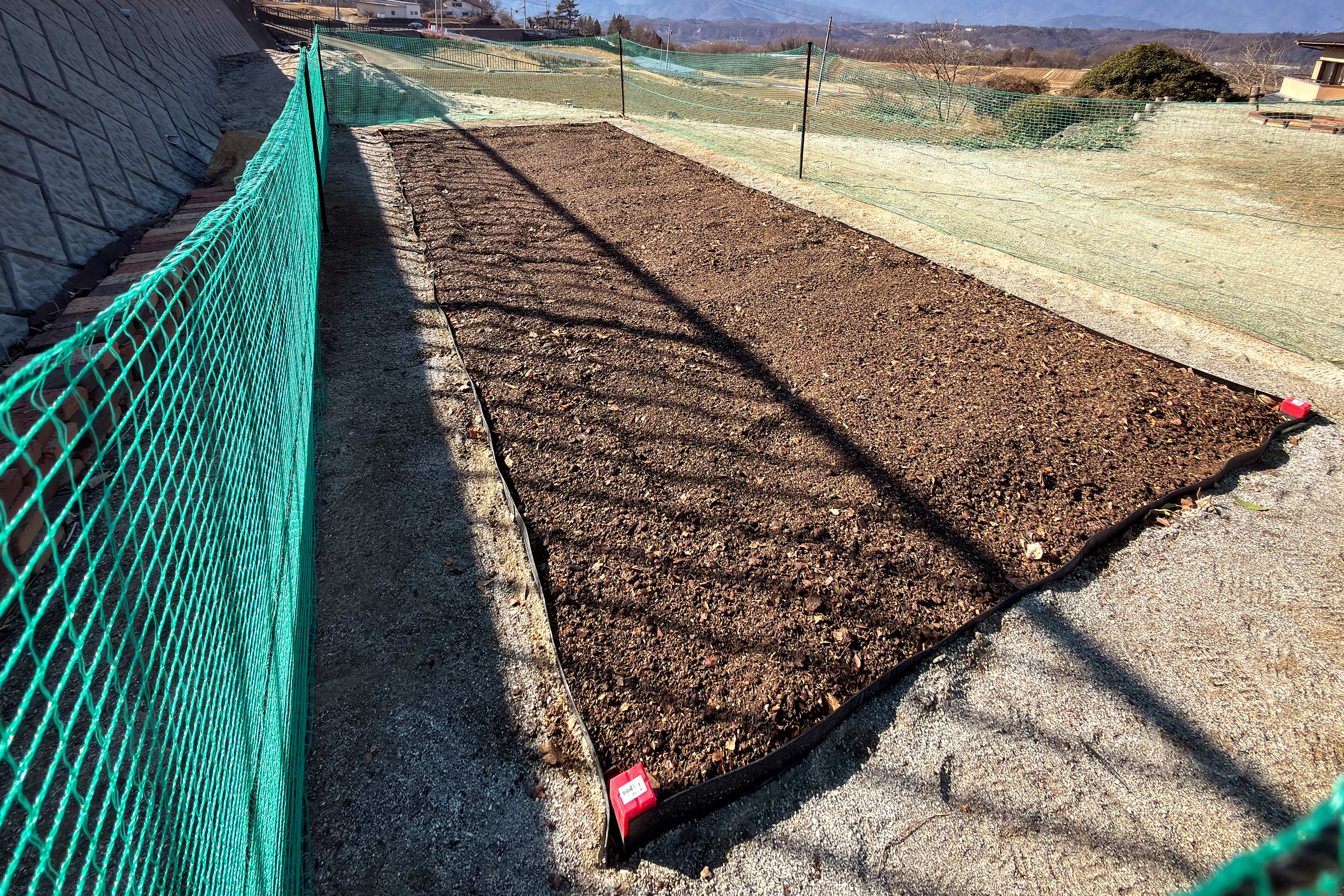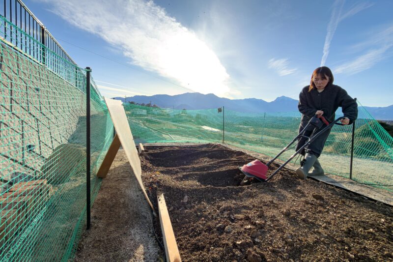 今月に入って我が家の畑にはあぜガードを地中に埋め込む工事を行っていましたが、その際、畑と庭の境界部分を正確に削り整形した関係で畑の中にはその切り崩した硬い土の塊がゴロゴロと入ってしまい、再度柔らかい土へと転換すべく念入りな耕し作業が必要でした。本来であればそこまでを工事の日に完了させたかったのですが時間的に後日へ持ち越しとなり今週末がその作業日。