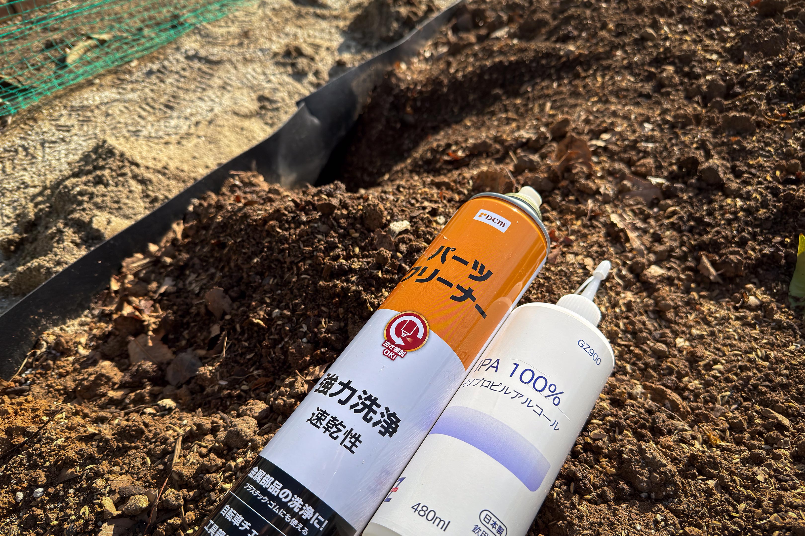 修理方法はシンプルで、裏側から同素材の当て板をして接着するだけ。すでに設置から1週間以上が経過していますからまずは自動車用のパーツクリーナーを使い綺麗にクリーニングを行い、その後IPAアルコーによる脱脂を行いました。