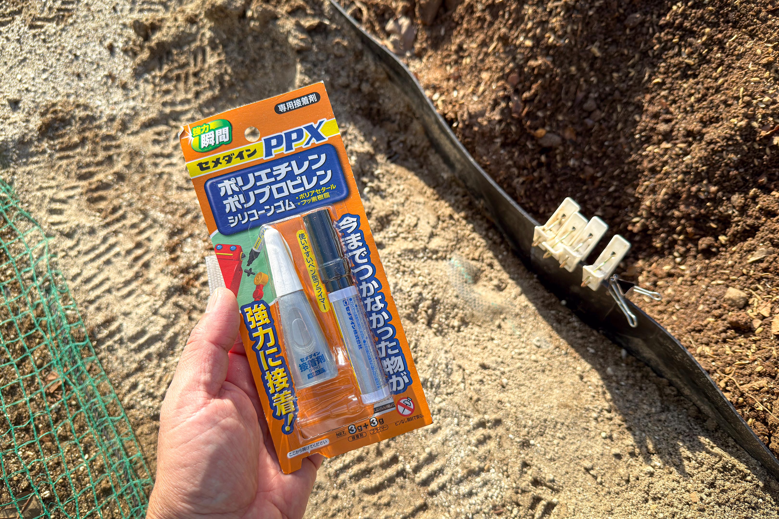 心配だったのは作業時の気温が5℃程度と低かったため固着するまでに時間を要するかと思いましたが、確かに瞬間とはいえないまでもせいぜい1分くらいで動かなくなりました。これでポリエチレン修理の実績ができましたから今後同様の破損があってもこの方法で簡単に直せそうです。