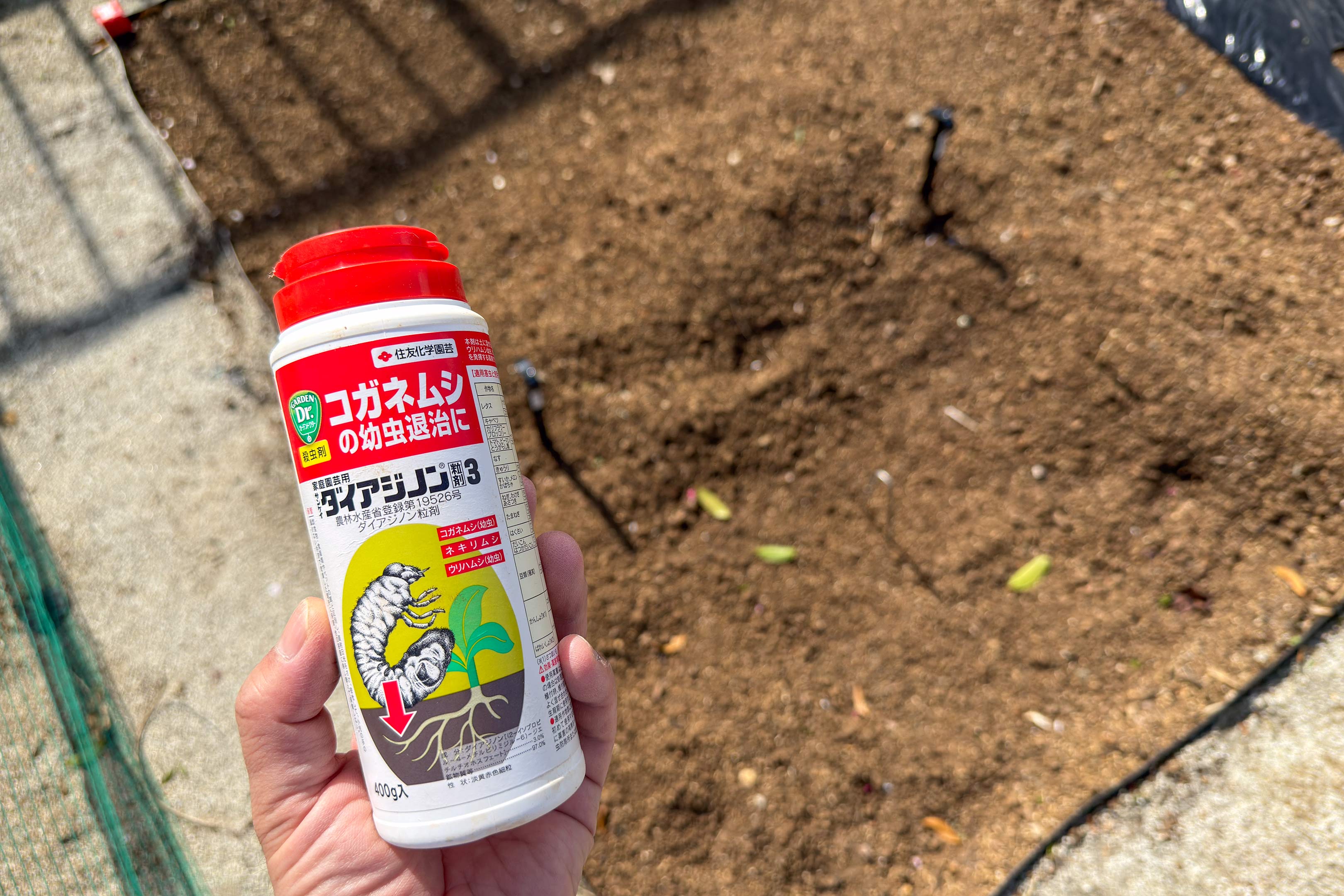 今回はナス・シシトウエリアだけにこれを撒きましたが、出来れば他の畝にも念のため撒いておけばよかったかもしれません。ダイアジノンはコガネムシの幼虫だけでなくネキリムシやヨトウムシにも効果があるらしいので、ジャガイモの新芽などを守る意味でも撒いて損はないと思います。