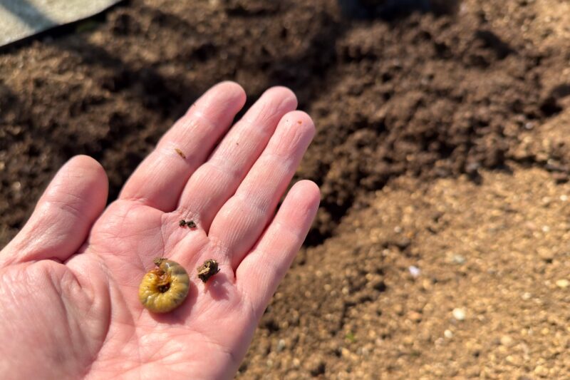 しかしいざ土を耕し始めると次々出てくるのはコガネムシの幼虫。こればっかりは柔らかな土にはつきものというか、畑を掘り起こせば必ずと言って良いくらい出てくるものですから仕方ないですね。