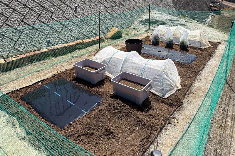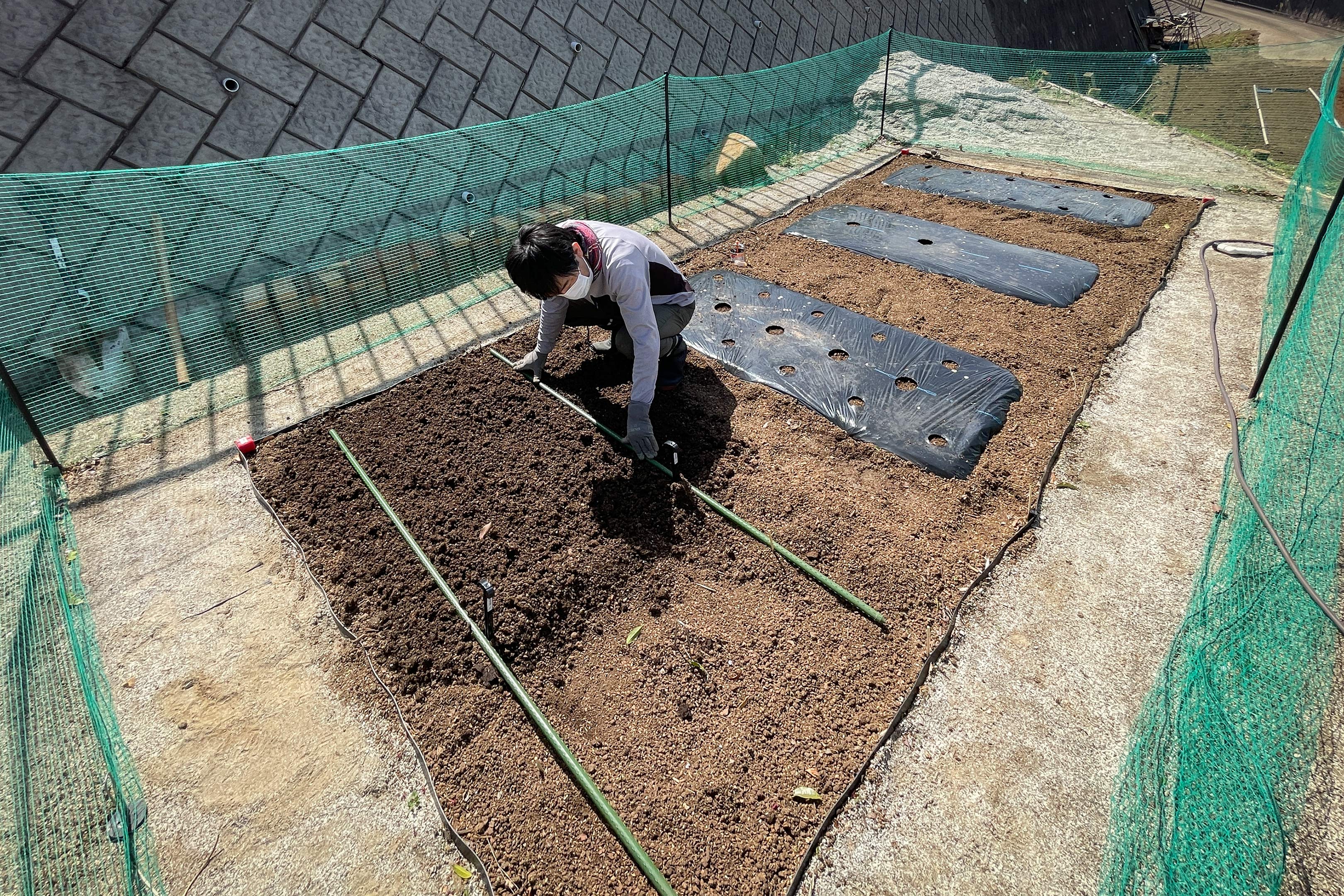害虫対策を終えたら続けて畝作りと黒マルチを敷く準備をしていきます。