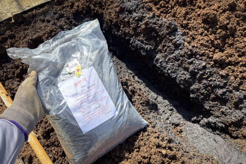 更にpHの安定と微生物の棲家の意味合いで竹墨も同時に溝施肥としています。我が家の畑は毎年このために竹墨を購入してあります。