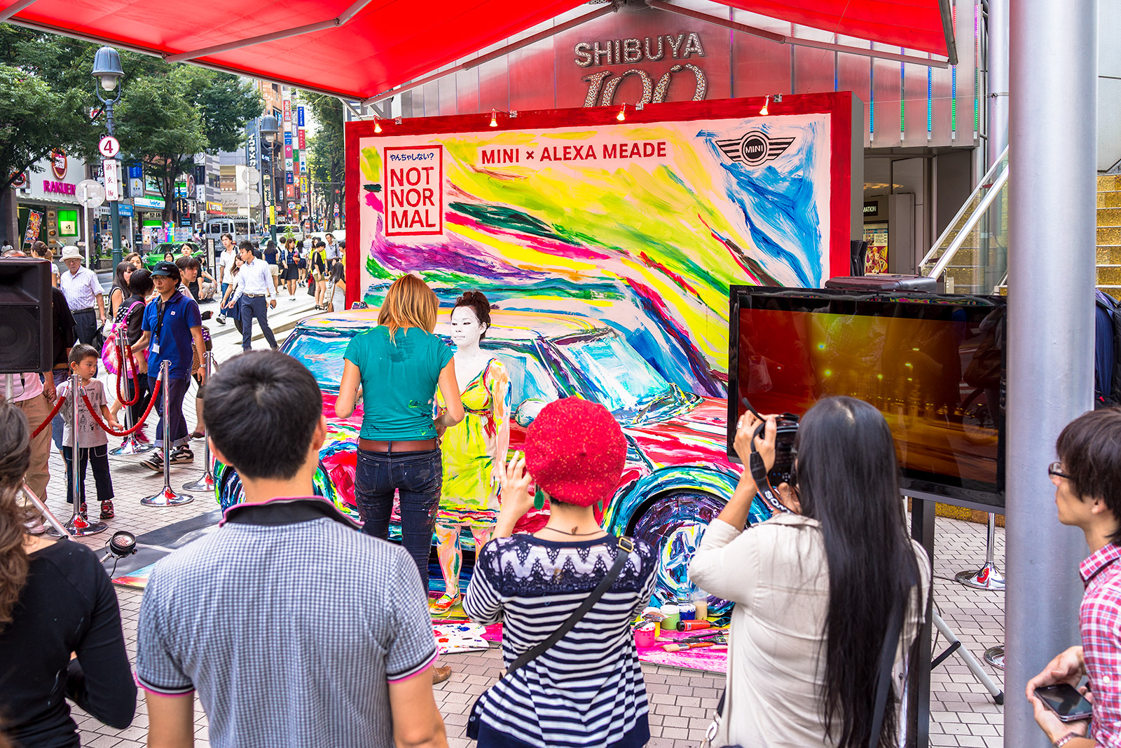 ALEXA MEADEさん(写真右)は以前「世界の果てまでイッテQ」というテレビ番組にも出ていましたからご存知の方も多いと思います。生身の人間にペイントをする事であたかも絵画のように見せるアーティスト。今回はそこへ本物のMINIもプラスしてMINIと人とのコラボレーション。上の写真のように正面から見ると本当に油絵のよう。