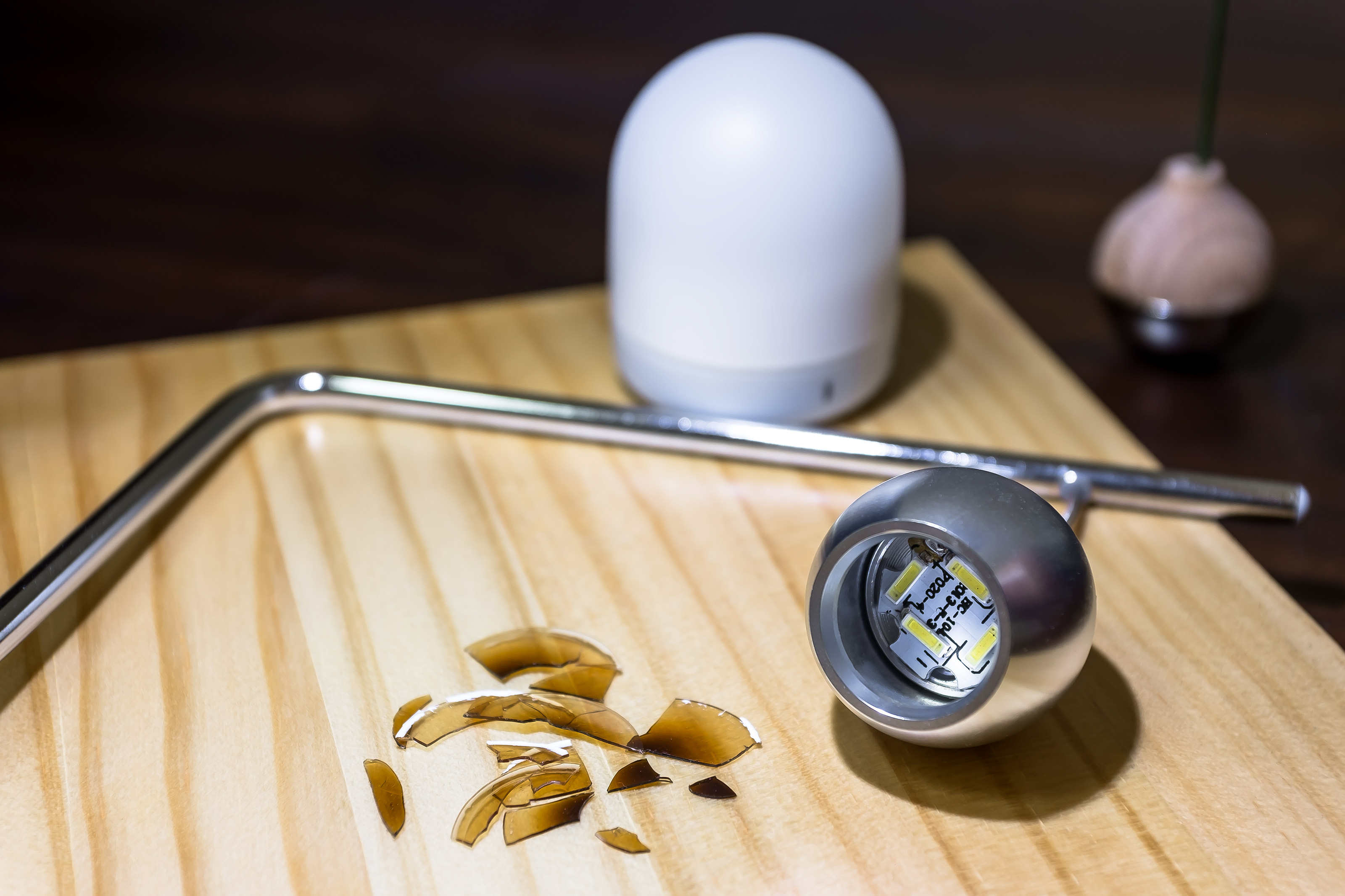 そう、点灯時に光源を覗き込むも眩しさのあまり、カバーが焦げている事には気付かずただ黄色い光に見えましたが、消灯時に見てみるとLEDの手前にある透明カバーの汚れに気づくのです。いやーそれにしても真っ黒でした。真ん中の辺りなどよく光が透過すると感心してしまうくらい。アルミ筐体とはいえ小さなボディに2WのLEDが押し込められていますから熱の影響は少なからずあったのですね。それが1年点灯してチリも積れば...というやつで。