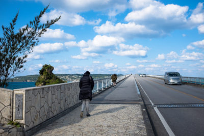 多くの人は車で渡ってしまいますが、広い歩道もありますから時間があれば徒歩や自転車で渡ったらこの上なく海の存在感を味わえると思います。この日も何人か歩いて挑戦している人を見かけましたが、いかんせん風が強かったですから渡り切れたか心配ですね。